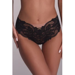 Figi AV 2176 Black od AVA to elegancja i komfort w klasycznym, ale pełnym zmysłowości wydaniu. Model typu pełne figi został wykonany z wyjątkowo miękkiej koronki w ponadczasowej czerni, która delikatnie otula ciało, tworząc zmysłowe prześwity z przodu i z tyłu. Przód fig ozdobiono subtelnym cielistym tiulem oraz złotą zawieszką w kształcie nieskończoności – symbolem kobiecej siły i klasy.