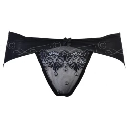 černé kalhotky Bell V-5133 jsou ušité z vysoce kvalitního mikrovlákna, které se nachází na přední a zadní straně modelu, zatímco průsvitný černý tyl s černou a stříbrnou krajkou korunuje boky modelu.