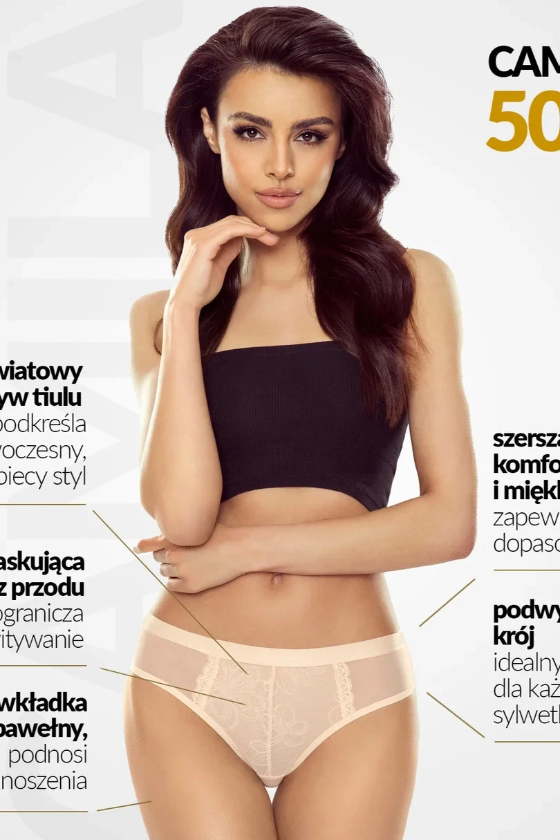 Výjimečně elegantní a pohodlné dámské kalhotky.Střih a gumičky. Maskovací síťovina na vnější straně předního dílu eliminuje prosvítání krajky.Pohodlí nositelky zvyšuje podšívka v rozkroku ze 100% bavlny.