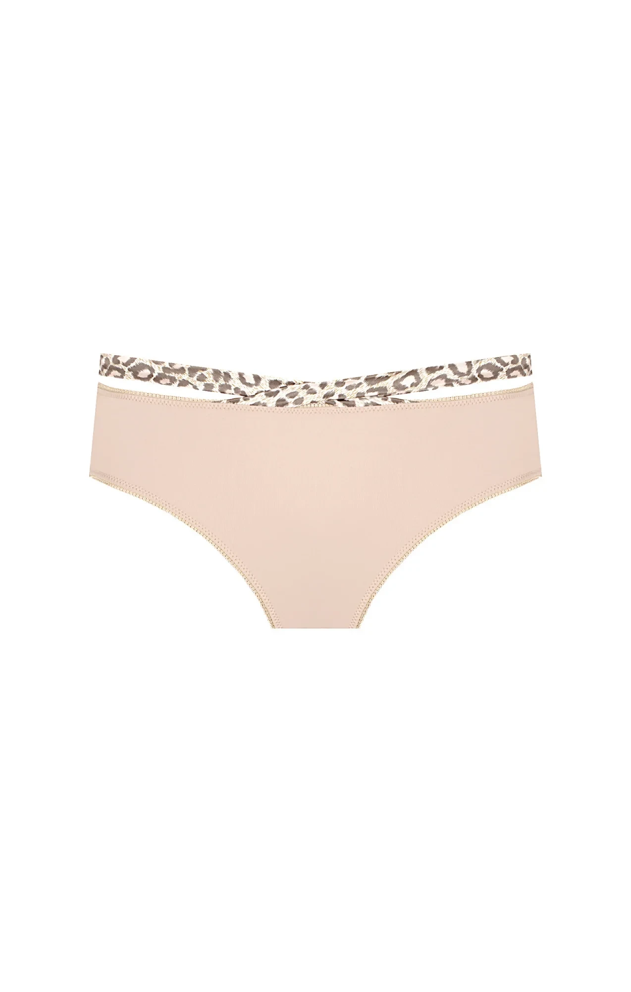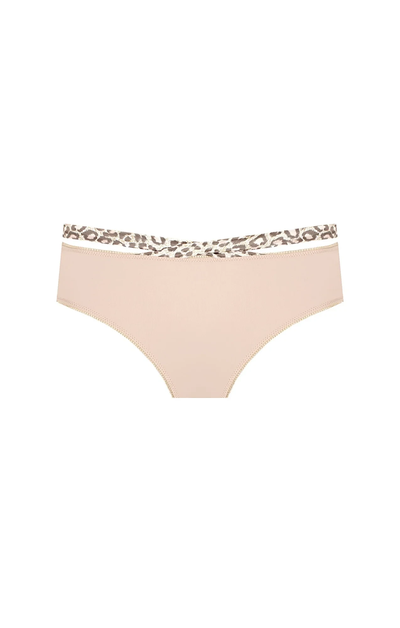 Zajímavý design, který okamžitě upoutá pozornost. Zde je spodní díl bikin, jehož přední část zdobí dvě křížící se tvarovaná ramínka. Sexy a jedinečné zároveň. Pro zvýšení efektu je vrchní část spodního prádla vyrobena ze saténu doplněného krásným kočičím vzorem. Hladké dno ve světle béžové barvě. Návrh hodný pozornosti!