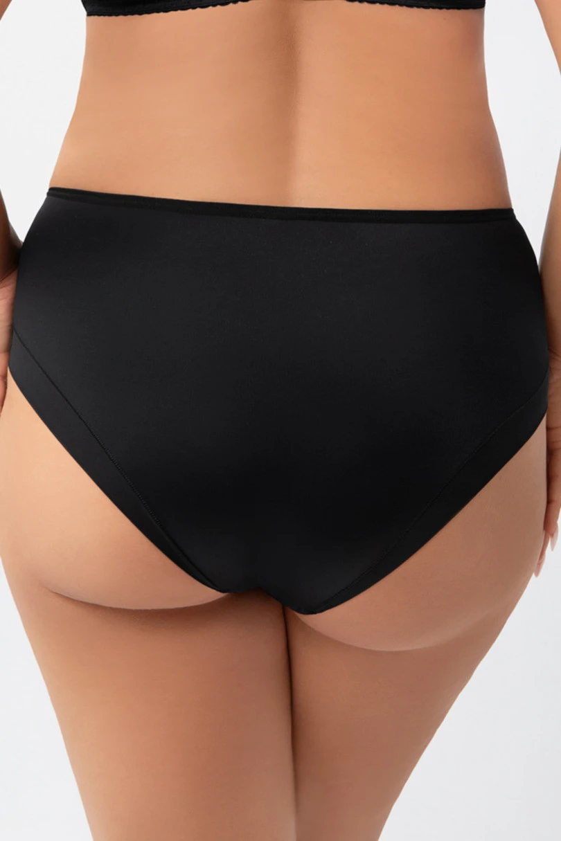 Klasyczne figi damskie w kolorze czarnym, łączące wygodę noszenia z eleganckim wykończeniem. Pełniejszy fason zapewnia dobre krycie oraz stabilne dopasowanie do sylwetki, dzięki czemu model sprawdza się na co dzień. Gładki przód i tył wykonano z miękkiego materiału, który komfortowo układa się na ciele i nie krępuje ruchów. Po bokach zastosowano lekkie, półtransparentne wstawki z tiulu oraz ozdobnej koronki o kwiatowym wzorze, nadające bieliźnie kobiecego, subtelnie zmysłowego charakteru. Starannie wykończone krawędzie pozostają dyskretne pod odzieżą, a dopracowana konstrukcja czyni ten model idealnym wyborem zarówno jako samodzielny produkt, jak i element kompletu bielizny.