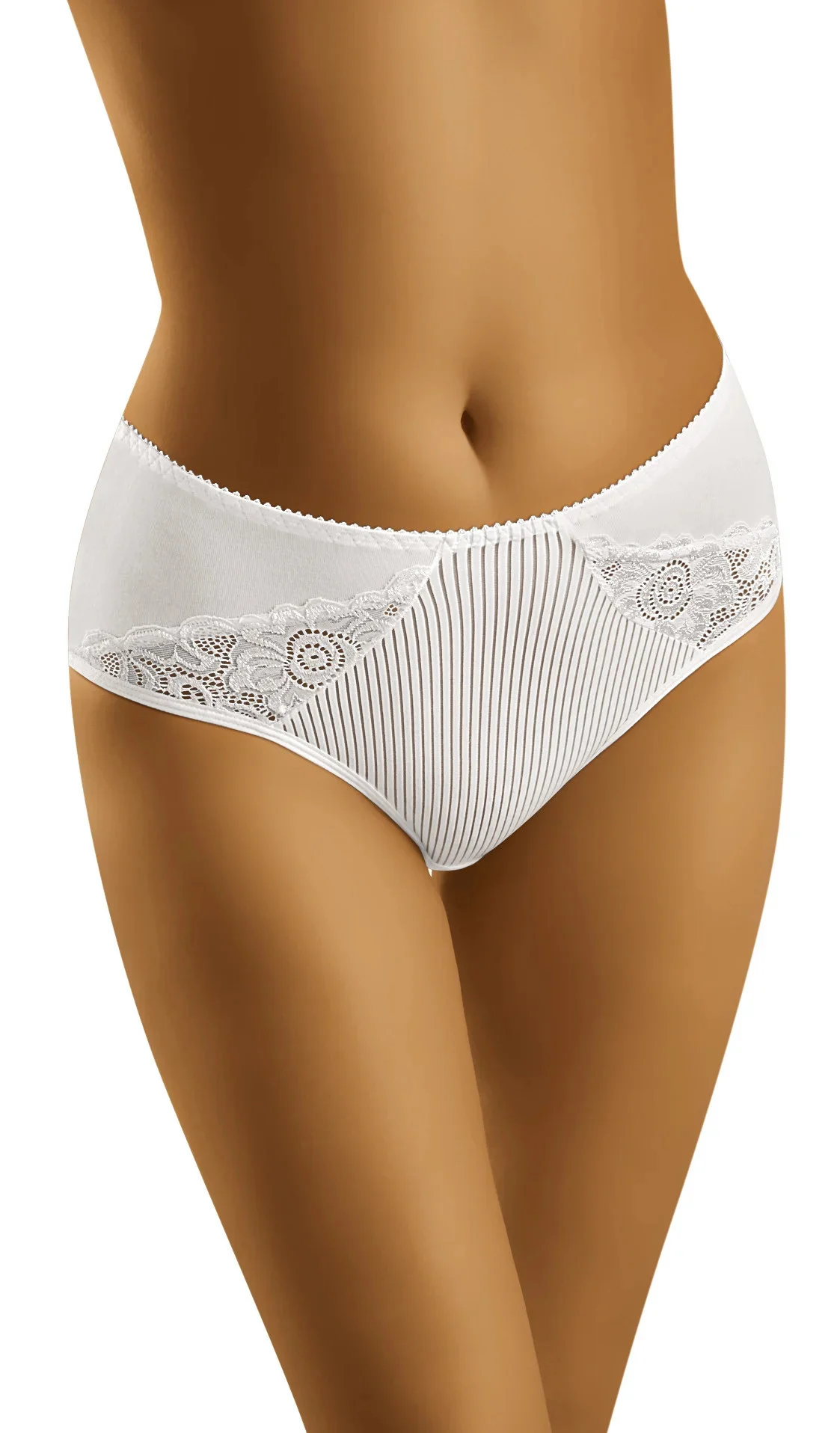 Zde jsou ideální kalhotky pro ženy, které milují bavlnu, s mírně vyšším pasem a pruhovaným úpletem a krajkovým lemem, který zvýrazňuje boky. 90 % bavlna, 7 % elastan, 3 % polyamid.