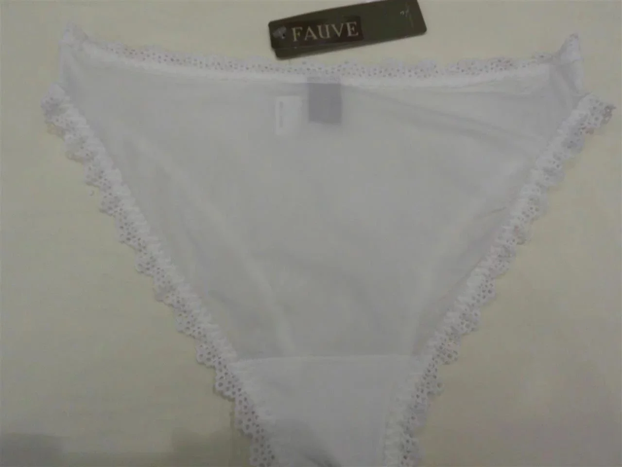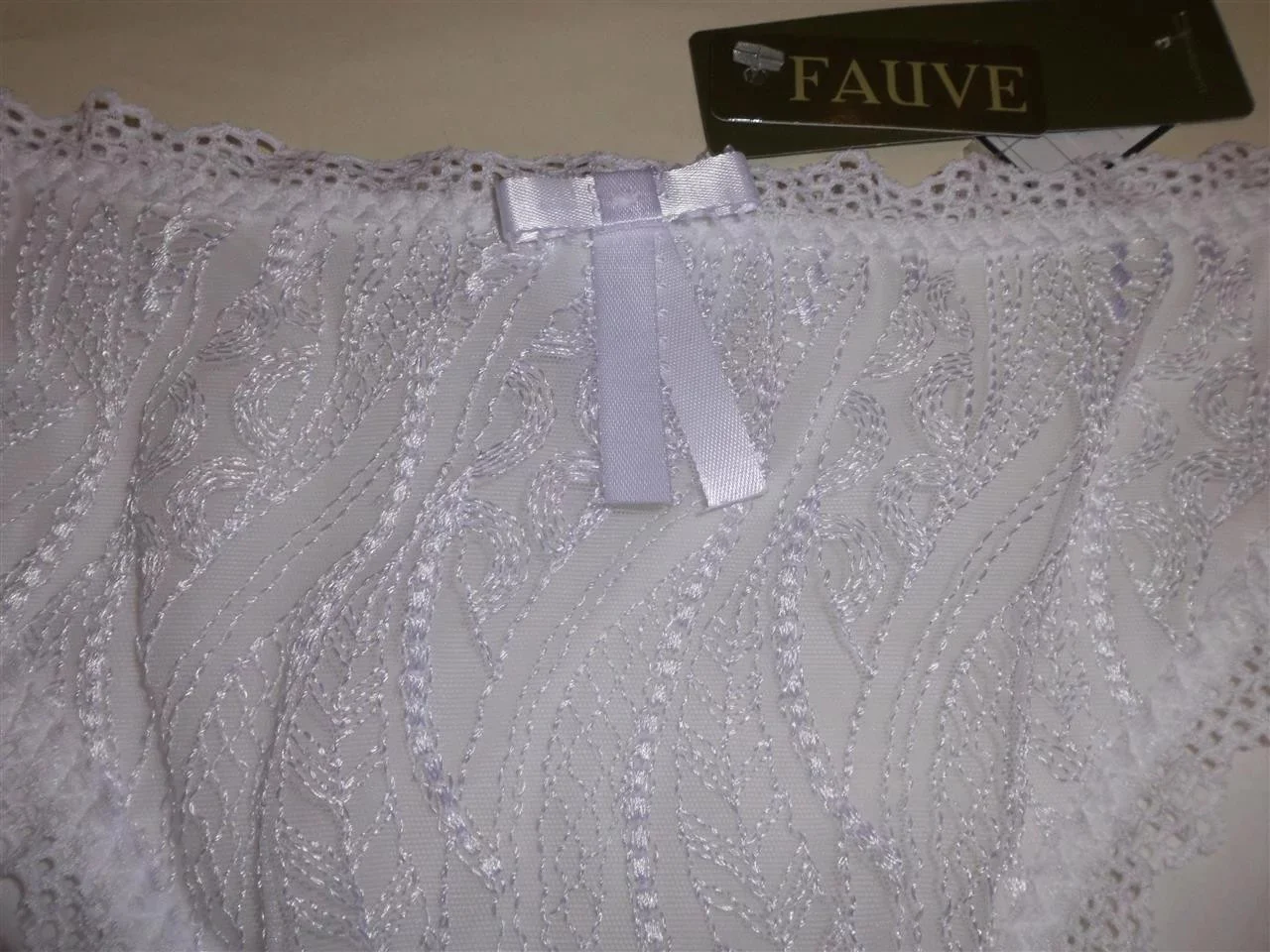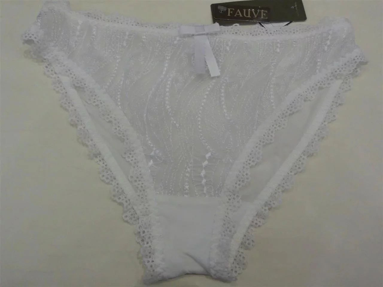 Kalhotky FV0275 Maya - Fauve klasického střihu, přední díl je z bílé krajky zdobený saténovou mašličkou. Složení 72% nylon 17% lycra 11% bavlna.