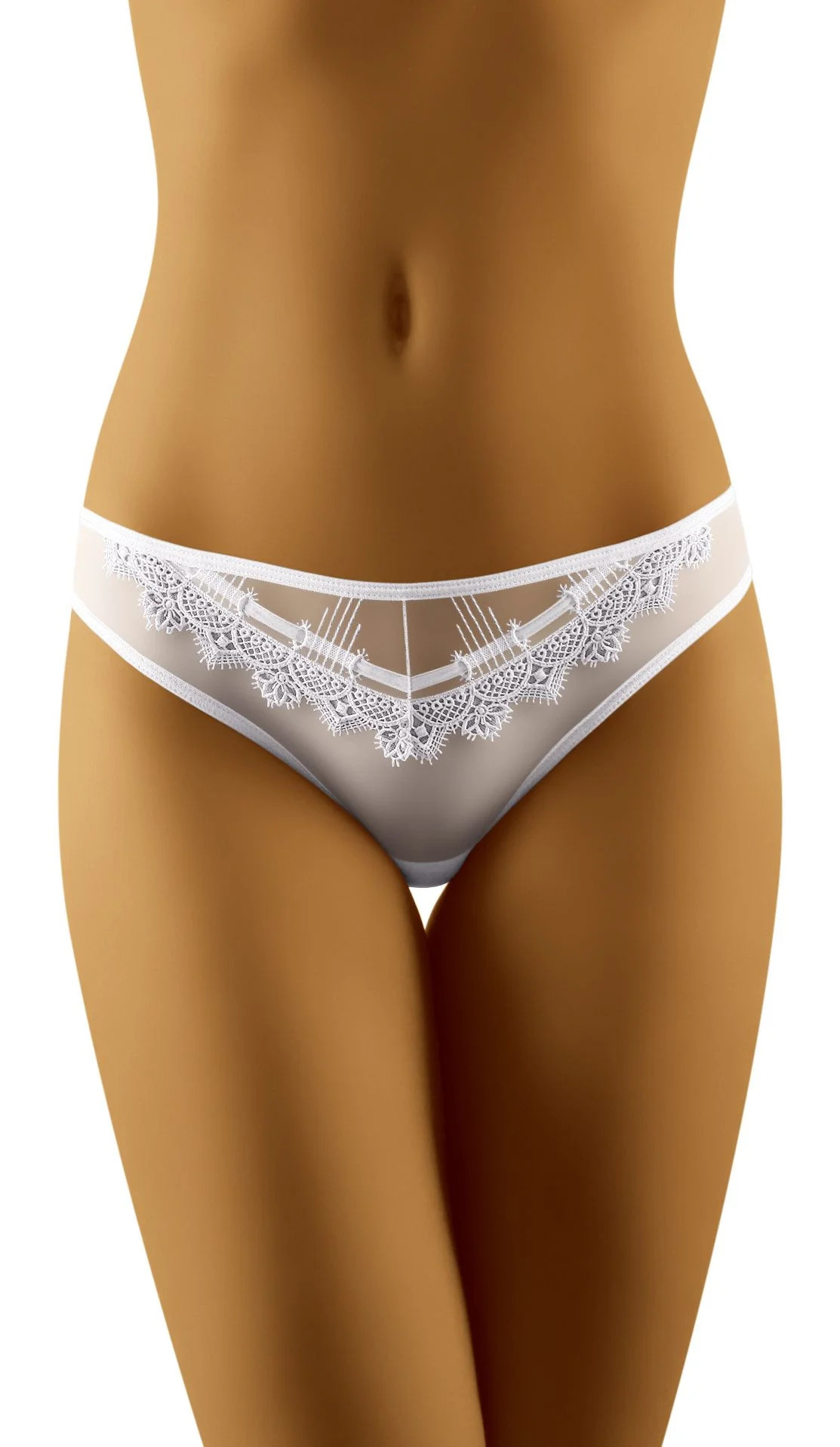 Klasické bikiny v plném střihu, vpředu zdobené krajkou, vzadu hladké