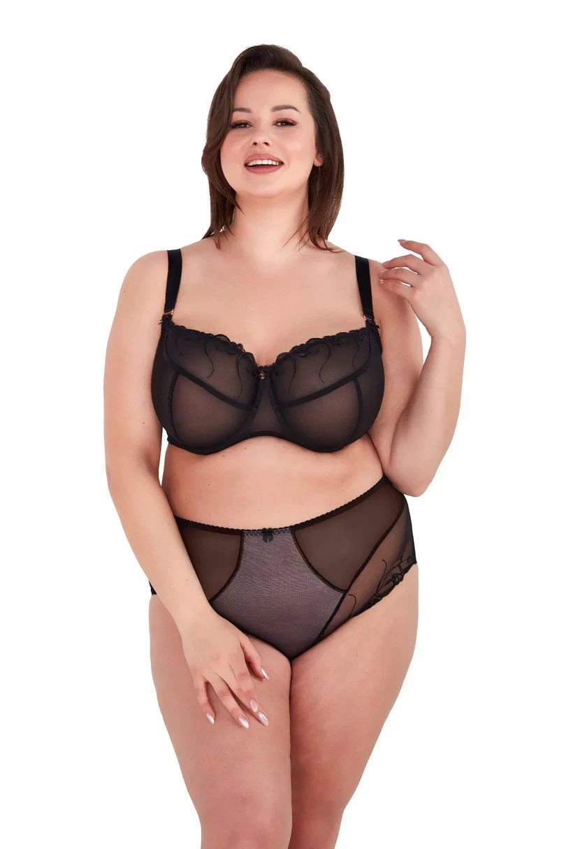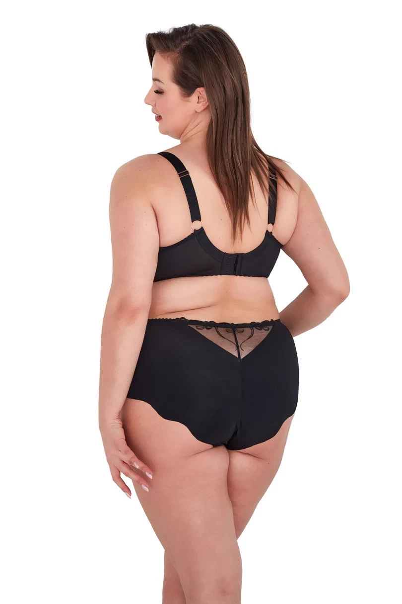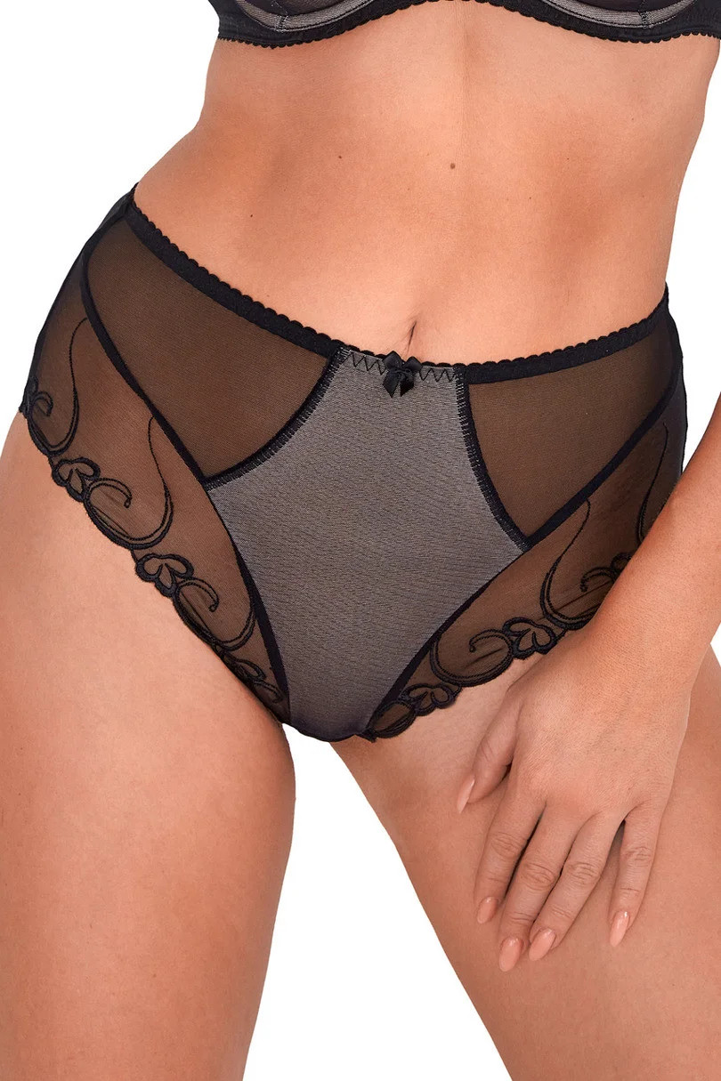 Kalhotky s vysokým pasem, kombinace tylu zdobeného výšivkou. Zadní část kalhotek dokončena bezešvě, laserový střih,