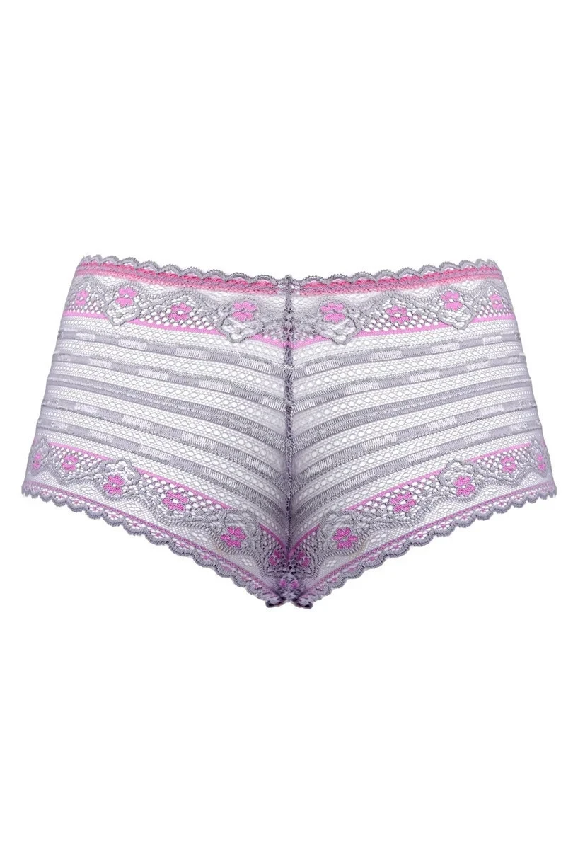 Klasické kalhotky z šedé krajky s květy amarantu. Po stranách je řez vestavěný, dno je dokončeno ploché.