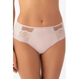 Wygodne figi damskie w jasnym, neutralnym odcieniu, zaprojektowane z myślą o codziennym komforcie i eleganckim wyglądzie. Pełniejszy, klasyczny fason zapewnia dobre krycie oraz stabilne dopasowanie do sylwetki. Gładki przód i tył wykonano z miękkiego materiału, który przyjemnie układa się na ciele. Boki wzbogacono o delikatne, półtransparentne wstawki z tiulu oraz ozdobnej koronki o kwiatowym motywie, co dodaje bieliźnie lekkości i kobiecego charakteru. Starannie wykończone krawędzie nie odznaczają się pod ubraniem, a dopracowana konstrukcja sprawdzi się zarówno na co dzień, jak i jako element kompletu bieliźnianego.