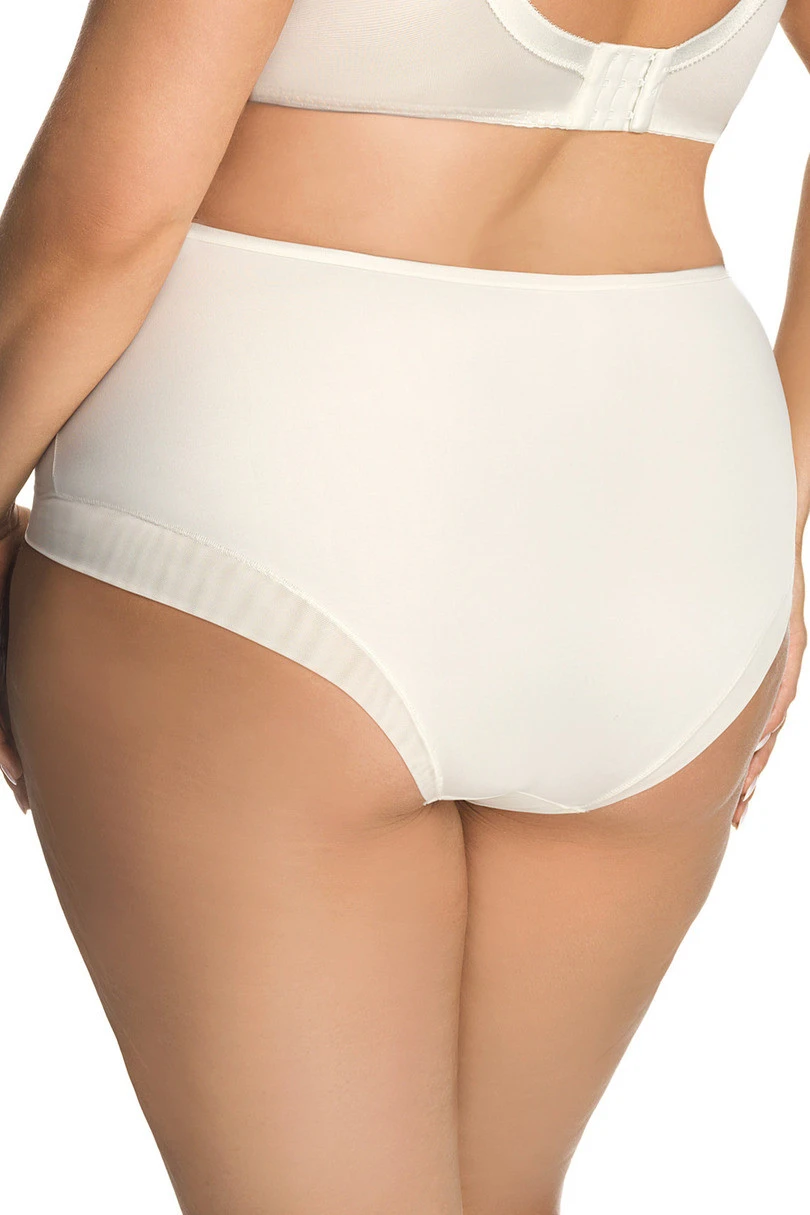 Eleganckie figi damskie w odcieniu ecru, zaprojektowane w wygodnym, bardziej zabudowanym fasonie. Pełny krój zapewnia dobre krycie i stabilne dopasowanie do sylwetki, dzięki czemu model świetnie sprawdza się w codziennym użytkowaniu. Przód i tył wykonane są z gładkiego, miękkiego materiału, który komfortowo układa się na ciele. Po bokach zastosowano lekkie wstawki z tiulu oraz ozdobnej koronki o delikatnym, kwiatowym motywie, nadające całości subtelnej lekkości i kobiecego charakteru. Starannie wykończone krawędzie zwiększają wygodę i pozostają dyskretne pod odzieżą.