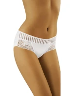 Jemné bílé kalhotky, které se budou líbit dámám, které ocení naprosté pohodlí. Přední díl částečně hladký, obohacený jemnou krajkou. Horní díl je zakončen poloprůhlednou pruhovanou gumičkou. Zadní část dobře krytá, hladká. Model je velmi pohodlný a elegantní. Zejména na jaře a v létě bude velmi užitečná.