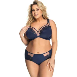 Elegantní tmavě modré kalhotky s velmi promyšleným tvarem. Vpředu a vzadu zakrývají a na okrajích jsou mírně průhledné, díky čemuž boky vypadají tvarovaně a velmi přitažlivě. Top s krajkovými vsadkami.