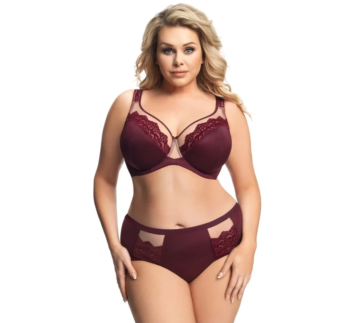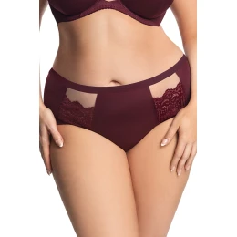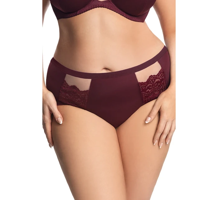 Působivé kalhotky ušité z kombinace dvou látek, dobře kryté a mírně průhledné, s průsvity umístěnými tak, aby nohy vypadaly o něco delší a zadeček tvarovaný a velmi ženský. Elegantní vínová barva se skvěle hodí ke každodennímu spodnímu prádlu.