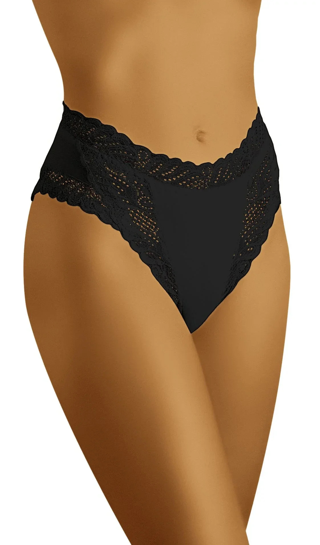 Elegantní dámské kalhotky, které krásně zdobí boky. Je vyroben z měkké, hladké tkaniny, která je na okrajích půvabně ovinuta jemnou, bohatou krajkou. Složení: 83 % polyamid, 17 % elastan.