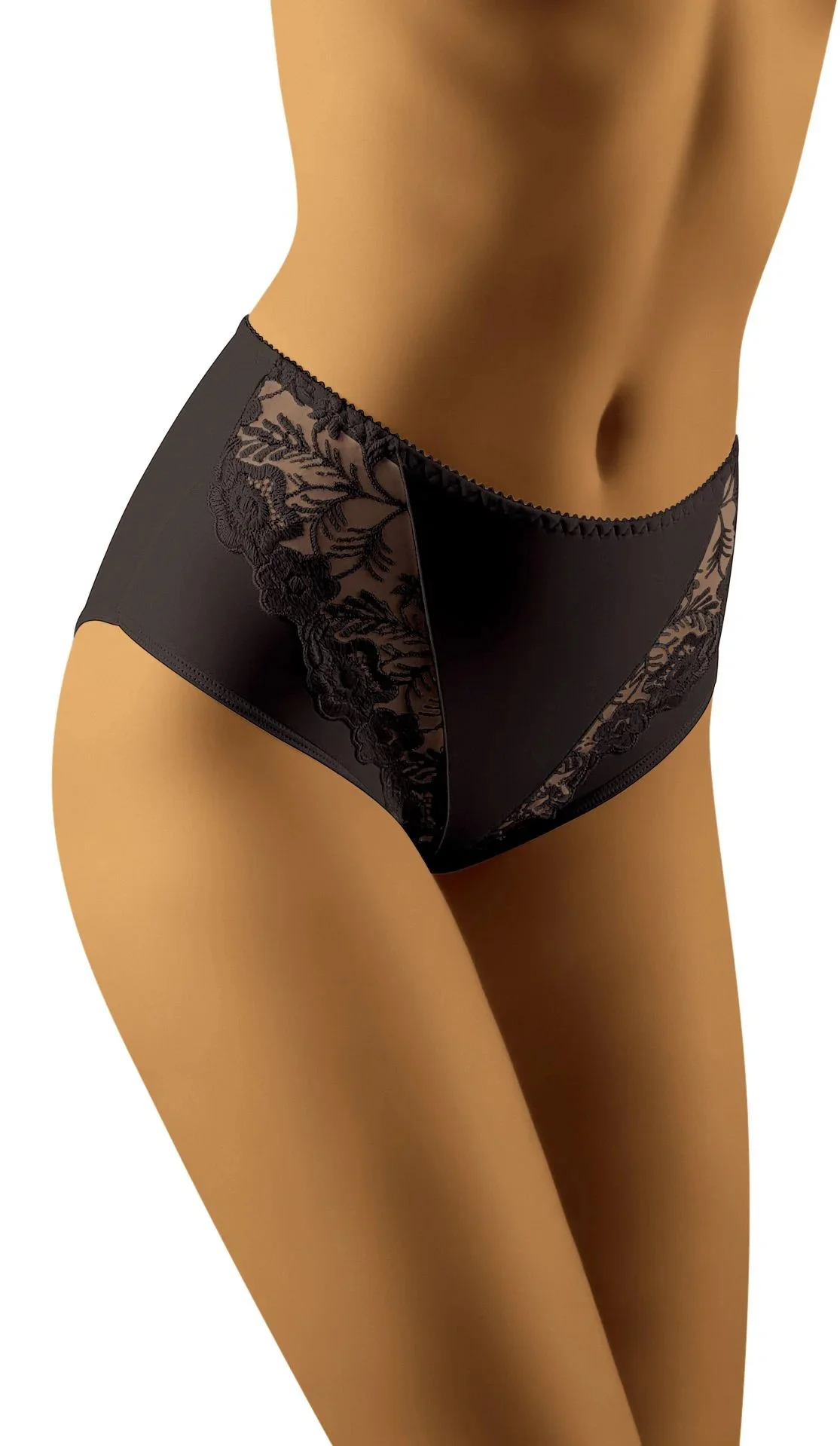 Gabe je mírně plnější spodní díl, který dokonale sedí na těle a pružně ho tvaruje. Zcela hladká zadní a přední strana je prošpikována ozdobnou krajkou, která koketně přechází po přední straně kompozice. Inspirujícím a výrazným prvkem se zde stávají velké, jemné květy s krásně rozkvetlými poupaty, které přinášejí úžasný, velmi ženský vzhled. Pohodlí v kombinaci s elegantním šarmem.