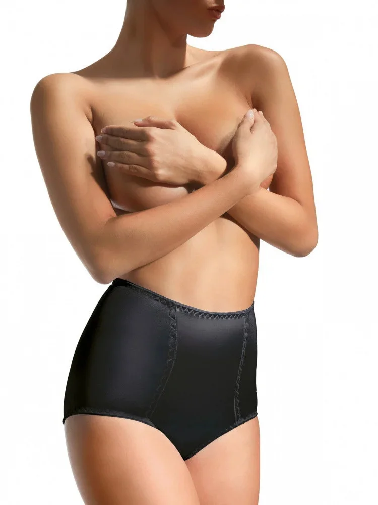 Černé tvarující kalhotky vyššího střihu, v horní části zakončené elastickým páskem. Jsou hladké, příjemné na dotek a zlepšují vzhled břišní oblasti. Složení: 80 % polyamid, 20 % elastan.
