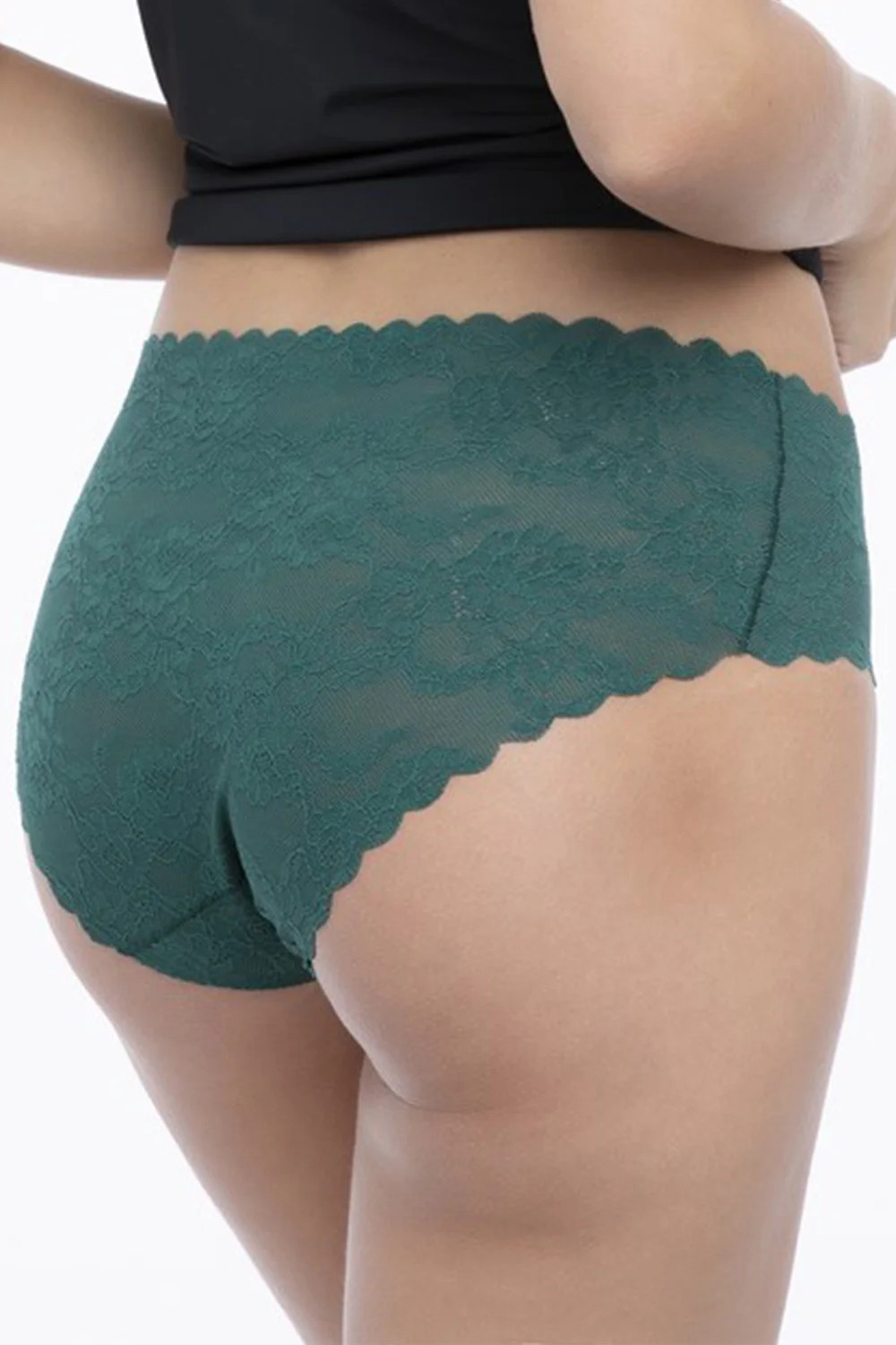 Elegantní krajkové kalhotky pro ženy. Pevné klasické kalhotky v barvě lahvově zelené, které lákají na pohled květinovým vzorem z elastické krajky a mušlovým lemem. Kvalitní krajka použitá na kalhotkách je hustá a dobře kryje. Díky použití technologie JULIMEX Laser-cut? nevyčnívají žádné nitě. V pase ani ve výřezech na stehnech nejsou žádné švy, takže kalhotky zůstávají neviditelné pod přiléhavým oblečením. Kalhotky mají v rozkroku všitou bavlněnou hygienickou vložku.