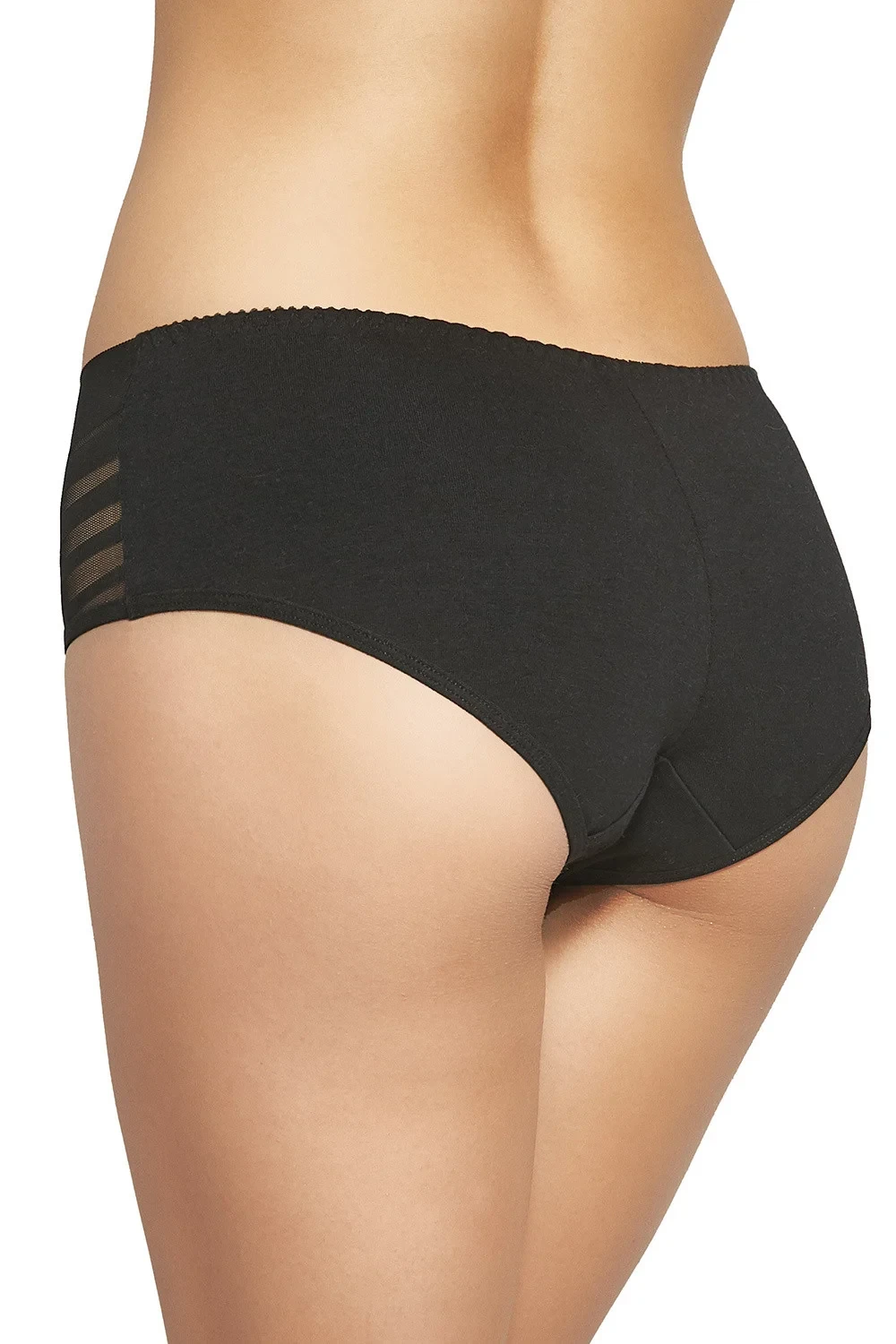 Tyto fíky kombinují klasický styl a moderní design, které se jistě budou líbit každé ženě. Tanga mají hladký zadek, což zajišťuje elegantní a minimalistický vzhled a pohodlí nošení pod jakýmkoli oblečením. Nízký výstřih tanga dodává smyslnosti a dělá je ideálními pro nošení s nízkým pasem kalhot nebo sukní. Na přední straně fík zdobí jemné síťové akcenty, které dodávají lehkost a jemný šarm. Ozdobná mašlička na přední straně připomíná úžasný detail, který zdůrazňuje ženskost a dodává fíkům zvláštní charakter. Vnitřní část fíků obsahuje bavlněný vložek, který poskytuje hygienu a komfort po celý den. Tyto fíky jsou skvělou volbou pro ženy, které si váží elegance, pohodlí a jemných detailů ve svém spodním prádle.
