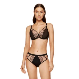 Elegantní kalhotky v černé a béžové barvě. Jsou vyrobeny z hladkého úpletu, síťoviny a výšivky s květinovým vzorem. Poutavé tylové zdobení na zadní straně kalhotek. Široký lesklý elastický pás udržuje kalhotky na svém místě. Klín kalhotek je vyroben z bavlny s normou OEKO-TEX?, díky čemuž jsou kalhotky příjemné a bezpečné pro intimní oblast. Kalhotky jsou navrženy a ušity v Polsku.