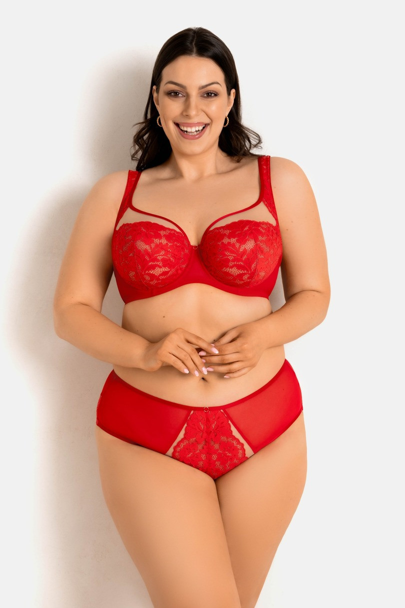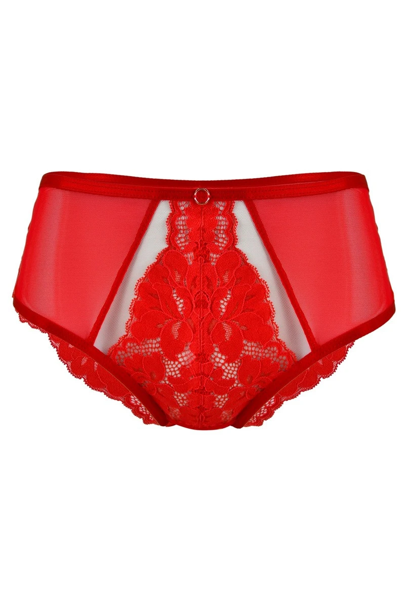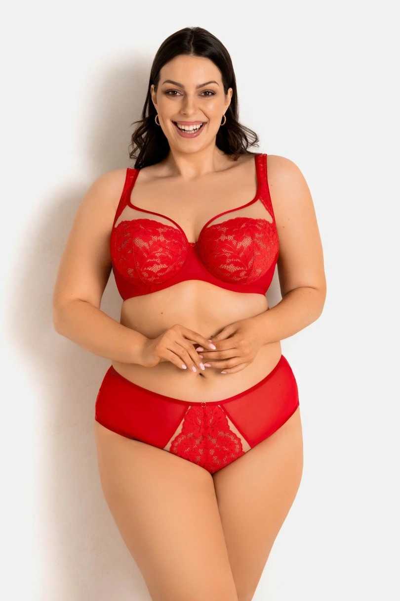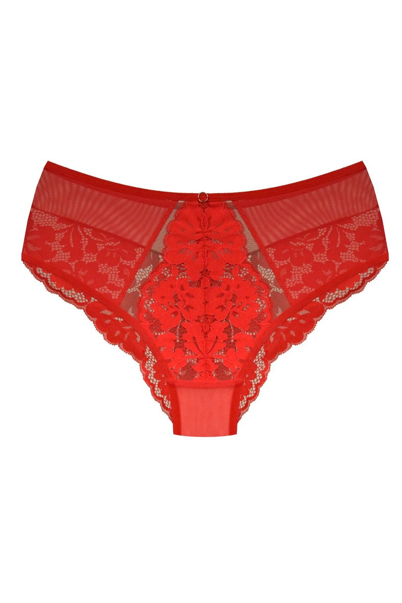 Figi Jasmin 19152 RED od Mediolano to połączenie klasycznej formy z nowoczesną, zmysłową estetyką, bogato zdobione elegancką koronką w intensywnym odcieniu czerwieni. Boki z przodu wykonane z transparentnej siateczki dodają lekkości, a tylna część z koronki subtelnie podkreśla kobiecą sylwetkę. Model z pełnym fasonem gwarantuje komfort i wygodę przez cały dzień. Bawełniany klin zapewnia higienę i oddychalność. To idealna propozycja dla kobiet ceniących zmysłowość połączoną z komfortem noszenia.