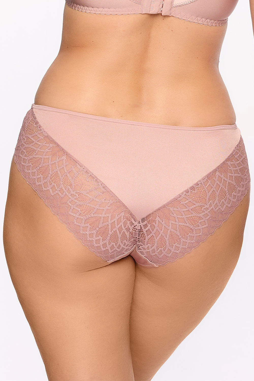 Klasické kalhotky z elegantní krajky a měkké mikrovlákno jsou kombinací pohodlí a smyslné estetiky. Přední část vyrobena z jemného mikrovlákna poskytuje pohodlí nošení, zatímco průsvitná zadní část s krajkou jemně zdůrazňuje ženské tvary. Model je vybaven plochou gumou, která neucpává a nevytváří odznaky pod oblečením. Dekorativní mašlička v pase dodává kalhotkám šarm a lehkost. Kalhotky jsou baleny v elegantní krabičce, ideální i jako dárek.