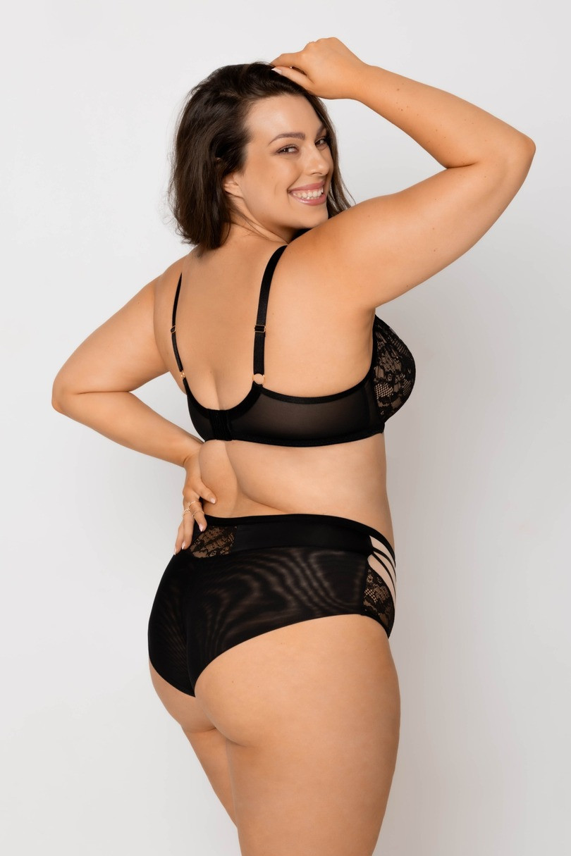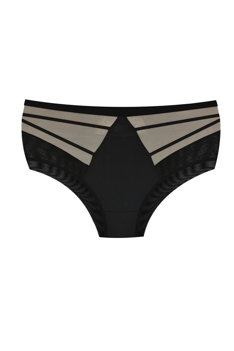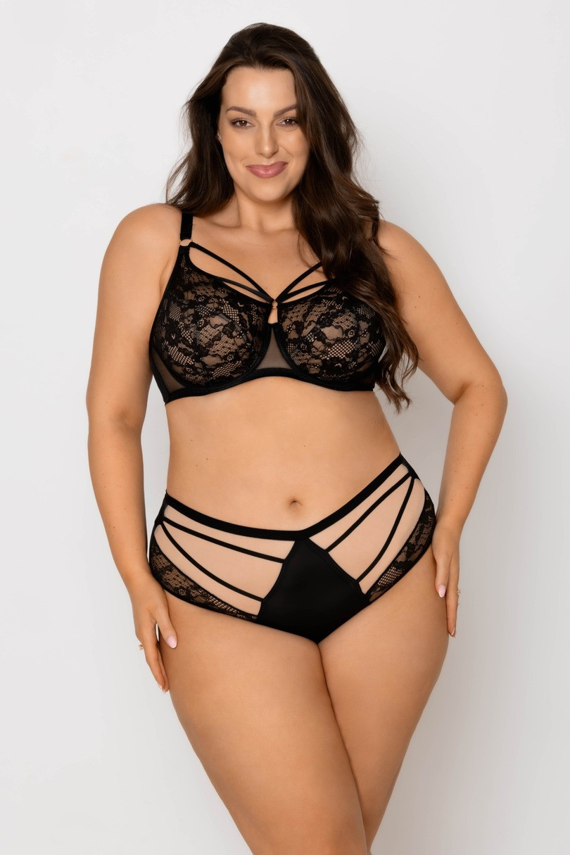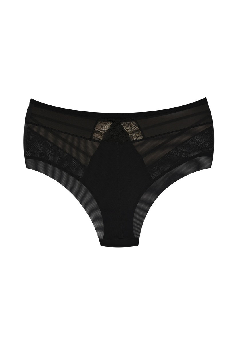 Odkryj wyjątkowe czarne figi z wysokim stanem, które łączą w sobie elegancję, zmysłowość i wygodę. Przód majtek zdobią efektowne paski oraz transparentny tiul połączony z delikatną koronką, które subtelnie podkreślają biodra i dodają charakteru. Tył wykonany z gładkiego, miękkiego tiulu zapewnia komfort noszenia i idealne dopasowanie do sylwetki. To idealna propozycja dla kobiet, które cenią sobie połączenie klasyki i nowoczesnego designu w bieliźnie.
