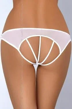 Skromné a svůdné kalhotky s hlubokým výřezem vpředu a zajímavými pruhy na zadní straně, vyrobené z jemné tylové síťoviny. Okouzlující volánky a saténová mašle lemující střih dodávají šarm.