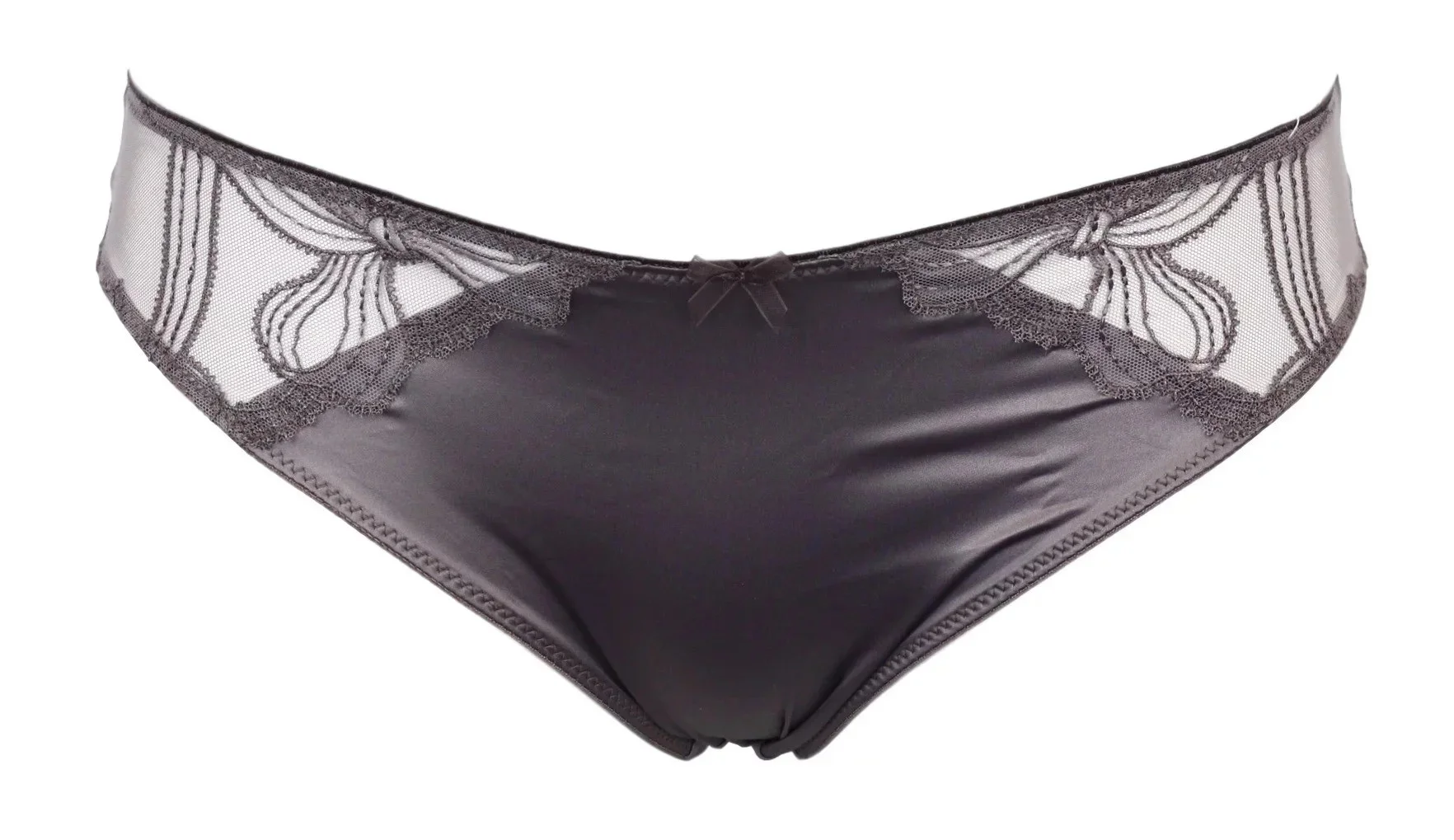 Kalhotky 81045 - Felina klasický střih, vykrojené s krajkovými bočními vsadkami v saténovém efektu. Barva šedohnědá, materiál 45% polyamid, 26% elastan, 21% polyester, 8% bavlna.