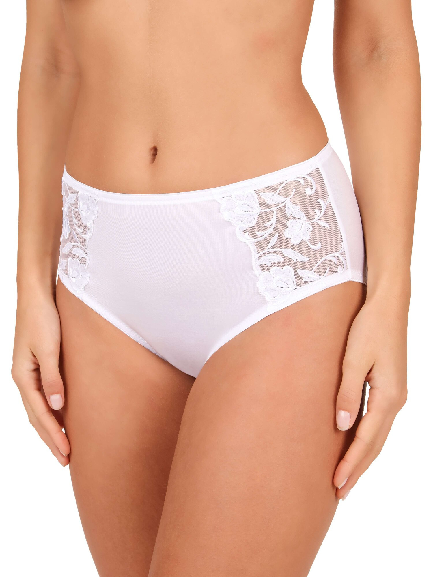 Přední strana kalhotek je hladká a boky jsou zdobeny průsvitnými tylovými vsadkami s květinovými motivy.