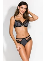 Miękki biustonosz Palermo zachwyca finezyjnym połączeniem materiałów i detali, oferując wyjątkowy komfort i styl. Miseczki w dolnej części wykonane są z delikatnego tiulu, który został pokryty elegancką, szarą siateczką, nadając całości subtelny wygląd. Obwód biustonosza, podobnie jak miseczki, również wykonany jest z tiulu obszytego siatką, co zapewnia lekkość i przewiewność. Brak bocznych fiszbin podnosi komfort noszenia. Przeszycia zostały dyskretnie przykryte czarnymi taśmami, które dodają biustonoszowi eleganckiego wykończenia. Górna linia miseczek jest ozdobiona delikatną czarną koronką, co dodaje całości zmysłowego uroku.