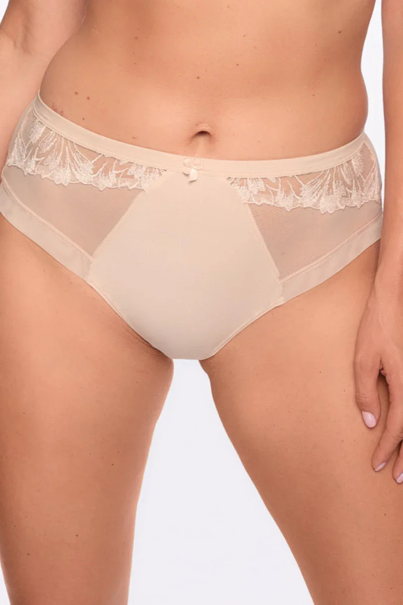 Model se vyznačuje průhlednými boky z jemného tylu zdobeného výšivkou, která prádlu dodává smyslný charakter. Hladká zadní část zajišťuje pohodlí a dokonalé padnutí, aniž by se ukazovala pod oblečením. Vynikající volba pro každodenní nošení i pro zvláštní příležitosti, kdy se chcete cítit krásná a sebevědomá.