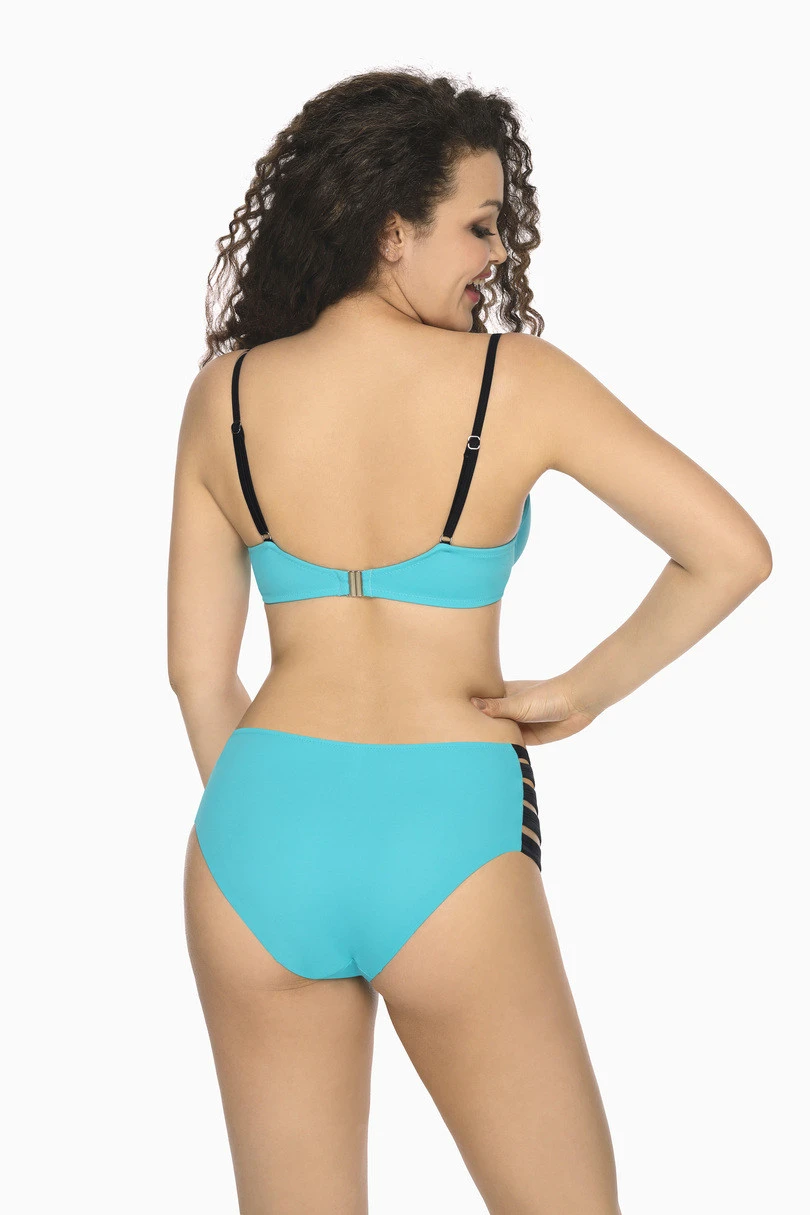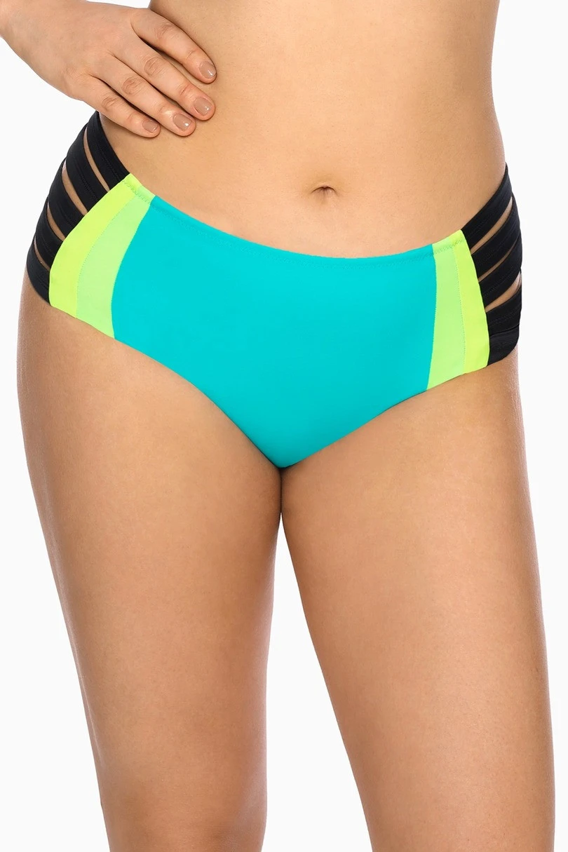 Wysokie figi kąpielowe z 5 czarnymi pasami na biodrach. Pastelowa kolorystyka w odcieniach seledynu i limonki przyciąga spojrzenia, a kontrastowe wstawki z czerni dodają charakteru projektowi.