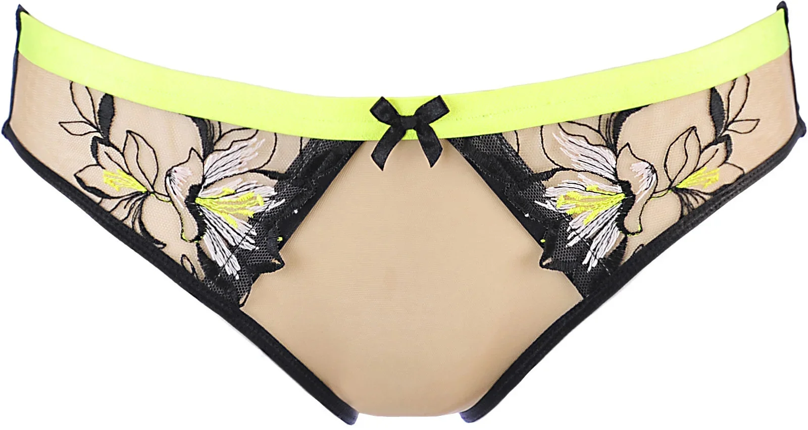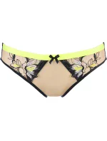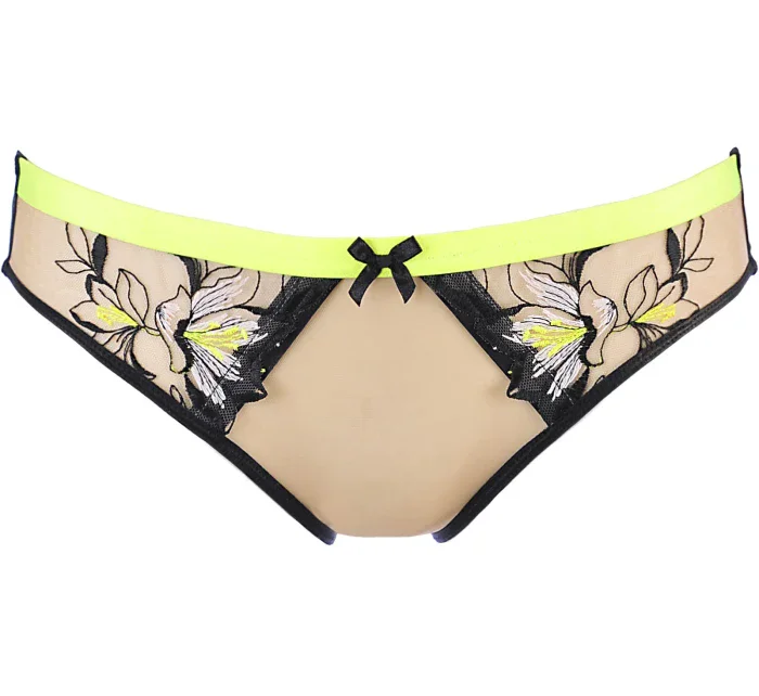 Krásné kalhotky, které můžete nosit denně i při zvláštních příležitostech. Jsou mimořádně pohodlné, přizpůsobí se vašim bokům a hýždím. Přední díl je zakončen černobílou výšivkou a neonově žlutými doplňky, ve střední části je zdobí mašlička. Zadní díl tvoří černé lemování a jemný béžový tyl pro vaše pohodlí při nošení. Kalhotky mají pohodlný a široký bavlněný klín. Materiálové složení: Polyamid 89 %, bavlna 8 %, elastan 3 %