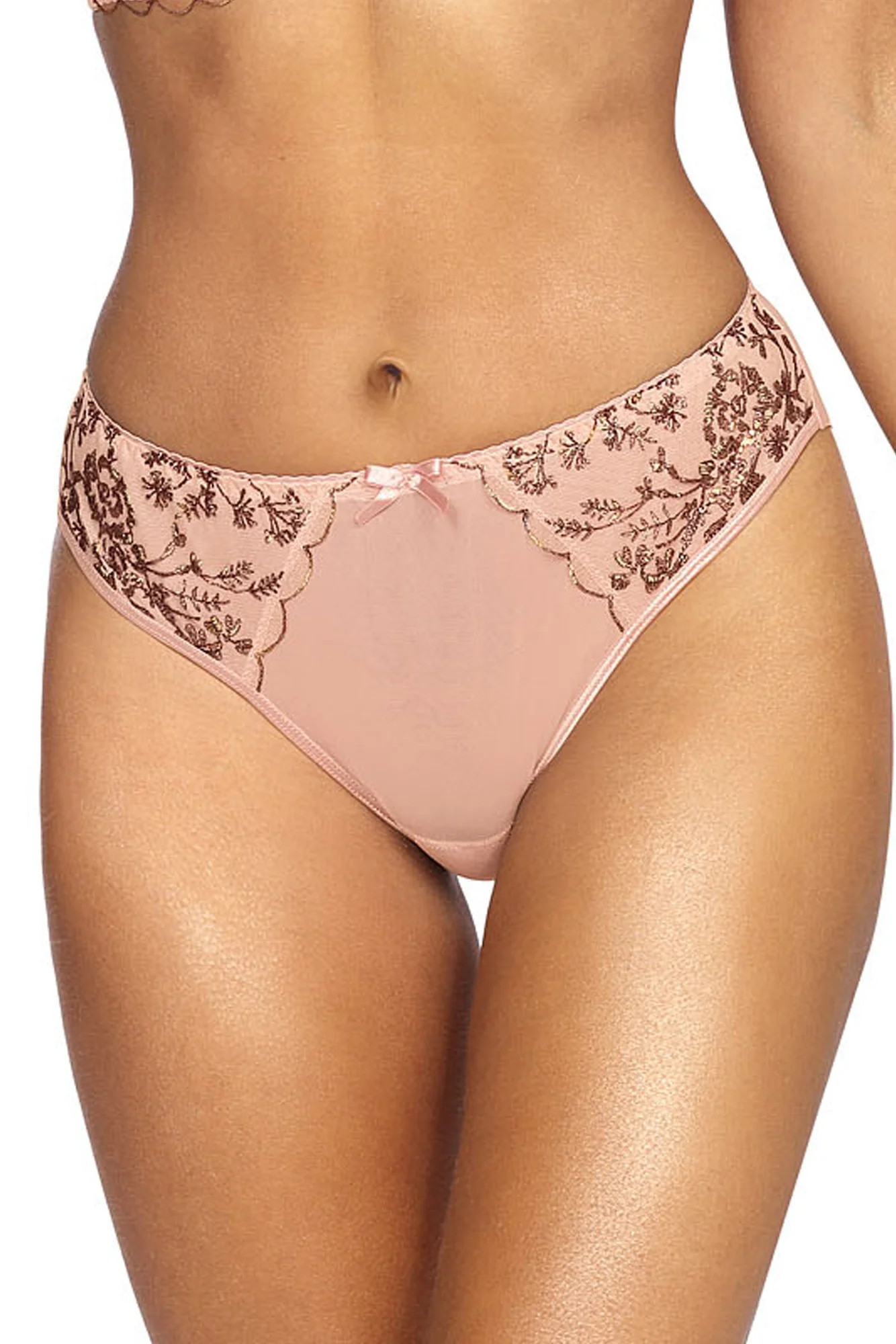 Fantasticky lehké a dokonale střižené kalhotky s třpytivou zlatou výšivkou okouzlí rozkvetlou smyslností. Skvěle doplňují letní soupravu a krásně zvýrazňují sluncem políbené tělo. Kalhotky z jemného tylu zdobeného bohatou zlatou výšivkou a bavlněným klínem pro vaše pohodlí při nošení.