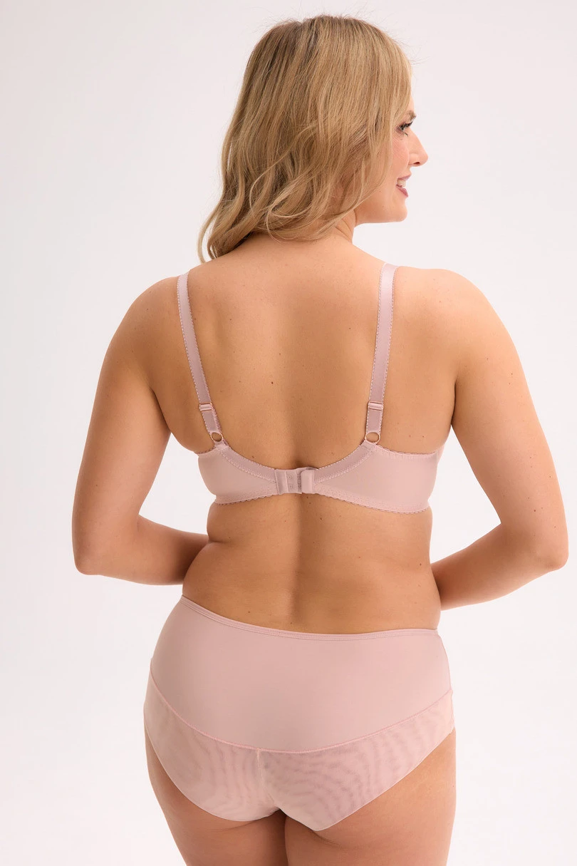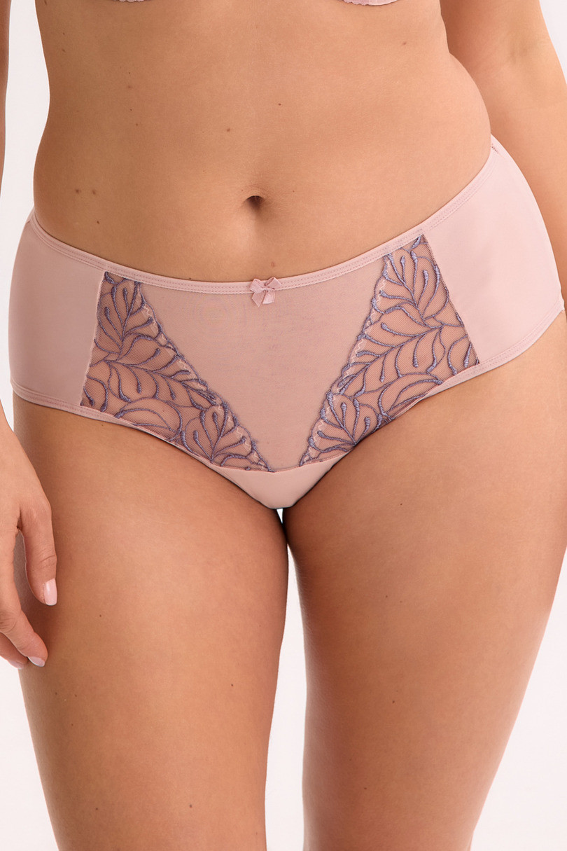 Wysokie figi w odcieniu pudrowego różu to połączenie subtelności, kobiecości i komfortu. Przód modelu zdobi transparentny tiul w połączeniu z delikatną, lawendową koronką, która tworzy efektowny, wysmuklający kształt litery „V”. Tylna część została wykonana z gładkiej, elastycznej mikrofibry, która miękko układa się na ciele i nie odznacza pod ubraniem. Wysoki stan pięknie modeluje sylwetkę, zapewniając uczucie wygody i pewności siebie przez cały dzień. Drobna kokardka z przodu dodaje całości uroku. Idealne do noszenia z biustonoszem z tej samej linii jako elegancki komplet.