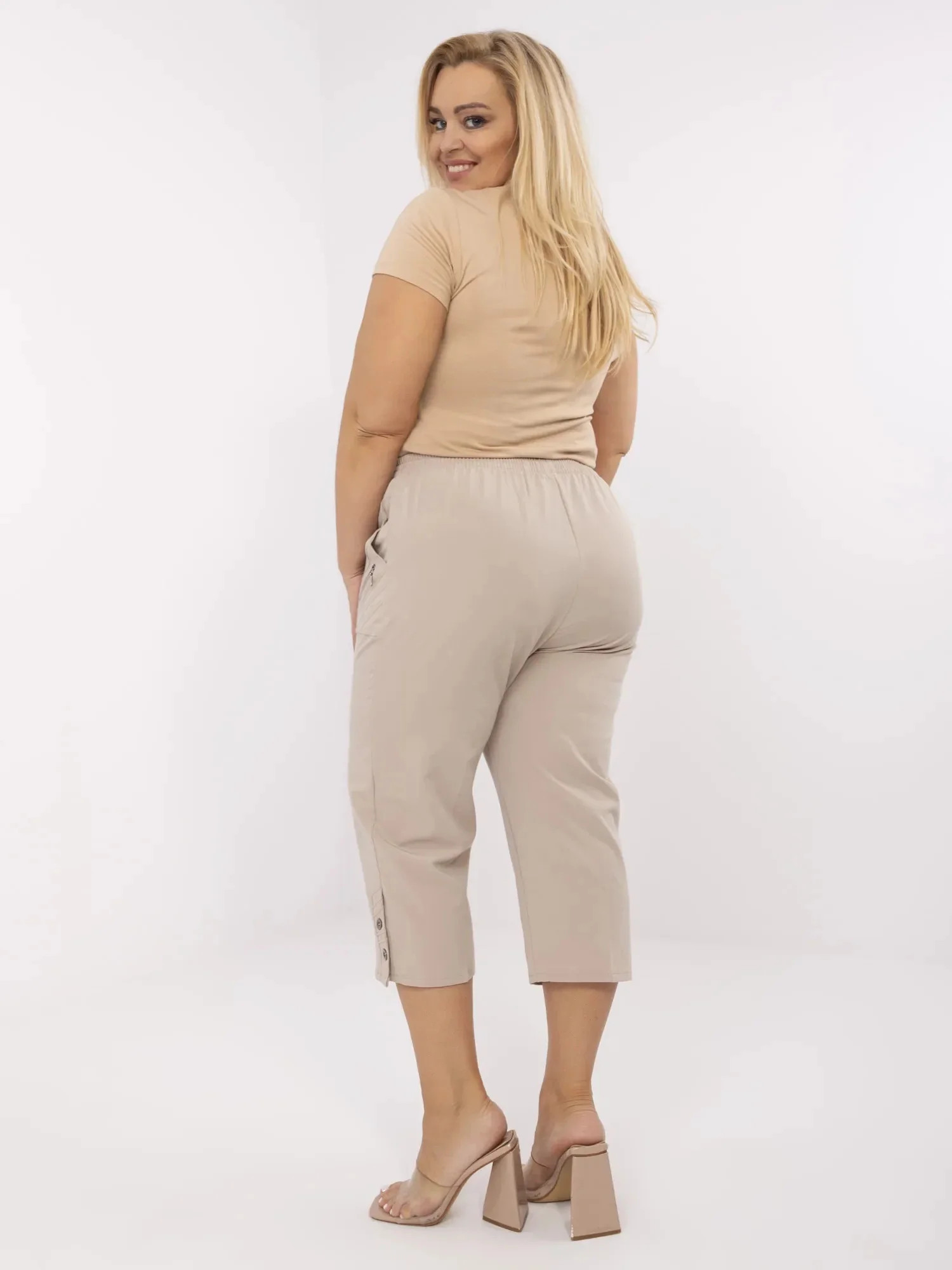 Rozměry kalhot velikosti 48: šířka v pase - 39 cm (na plocho), šířka v pase - 49 cm (při natažení), výška v pase - 31 cm, šířka v bocích - 57 cm, celková délka - 79 cm.