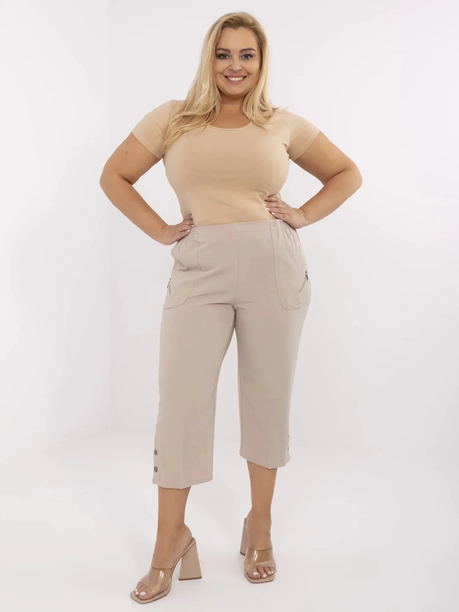 Modelka má na sobě velikost 48. Rozměry modelky: výška 167 cm, poprsí 118 cm, pas 90 cm, boky 118 cm.