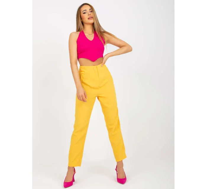 Tmavě žluté látkové kalhoty s rovnými nohavicemi .