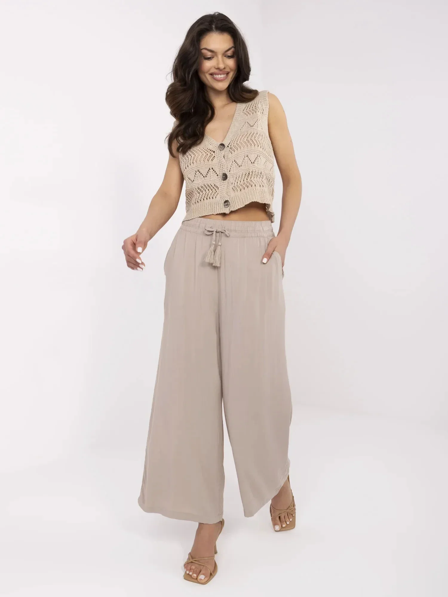 Má na sobě velikost S. Rozměry modelky: výška 173 cm, poprsí 89 cm, pas 65 cm, boky 91 cm