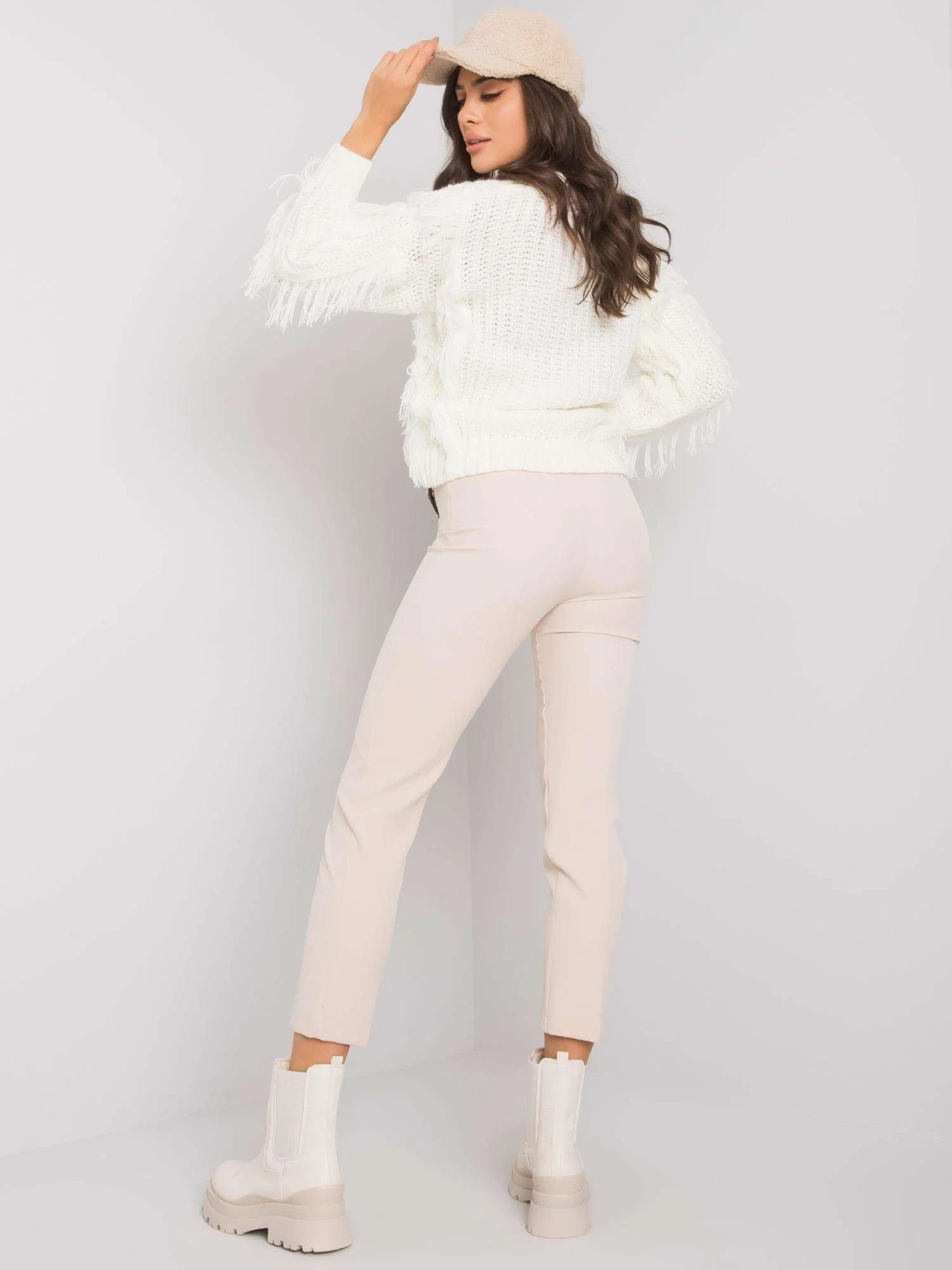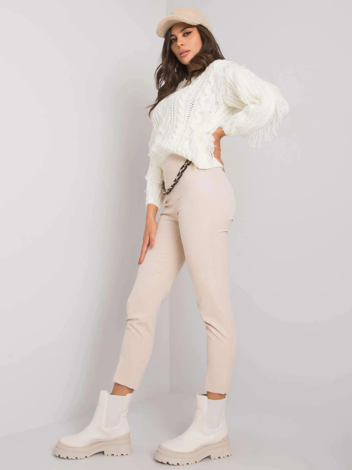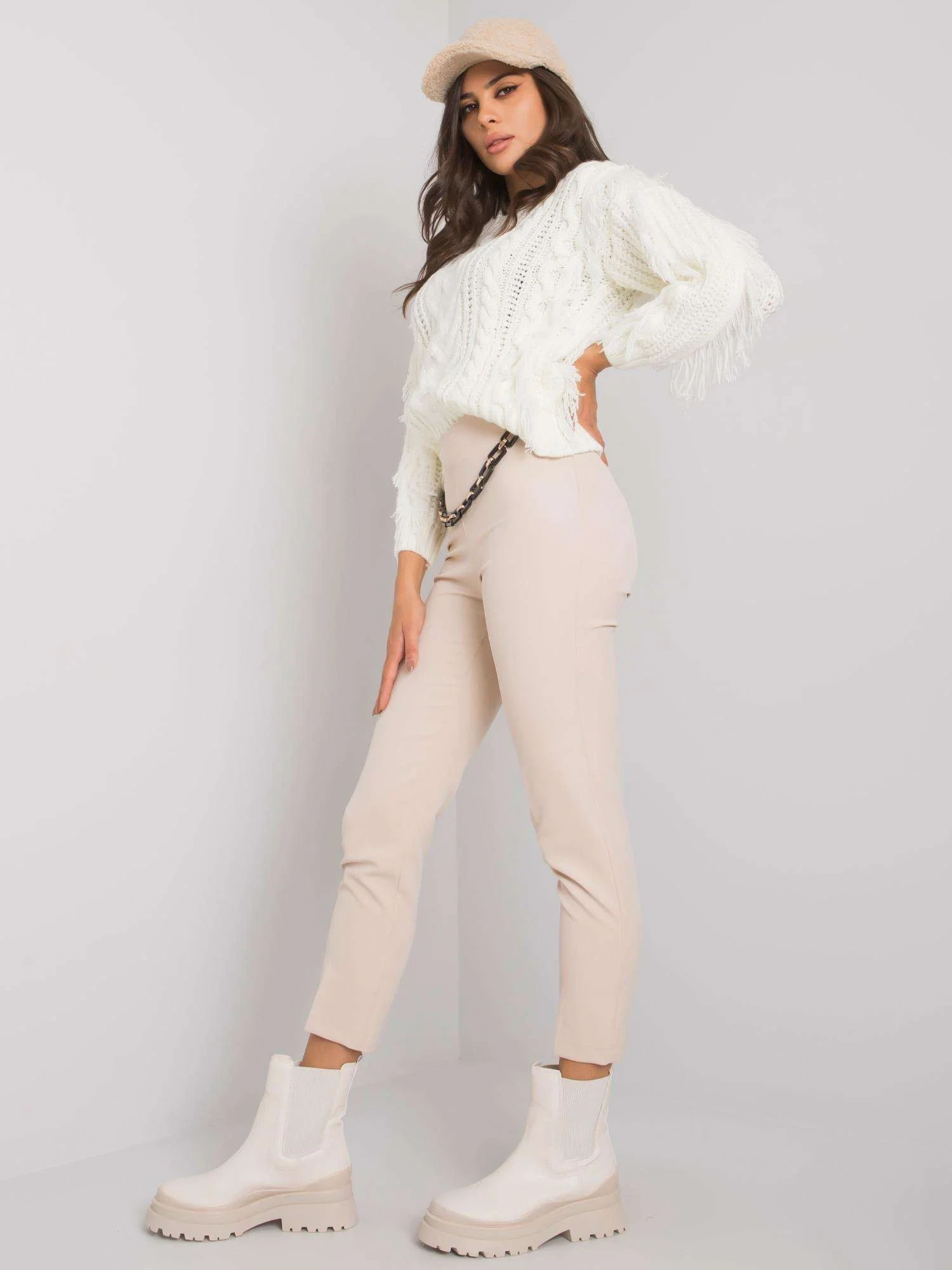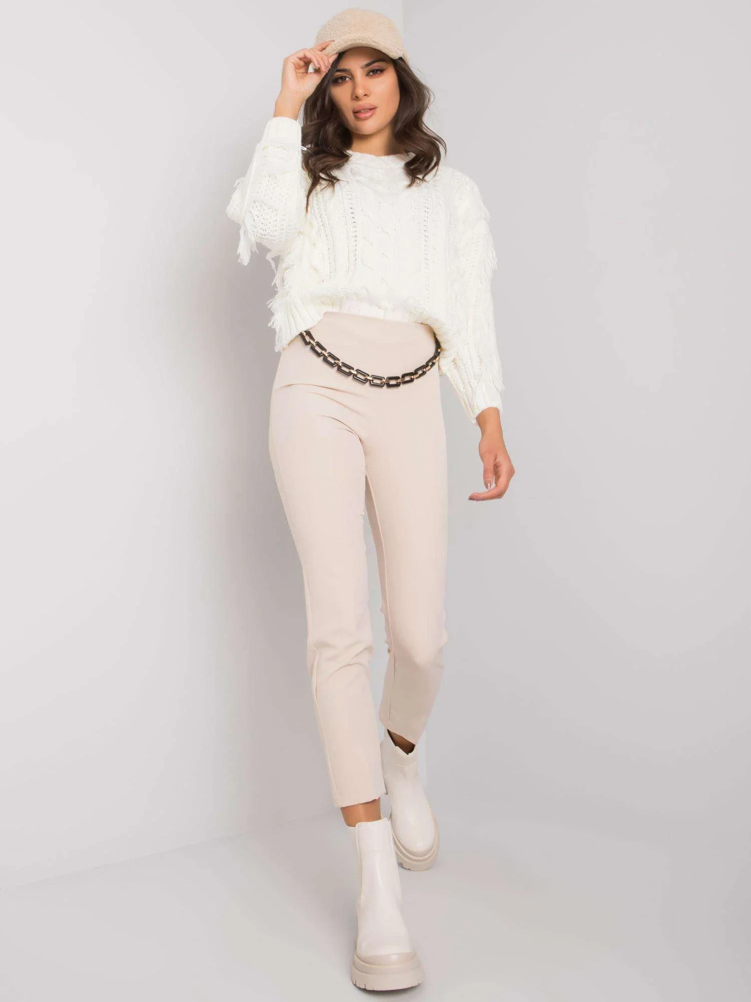Béžové kalhoty s řetízkem.