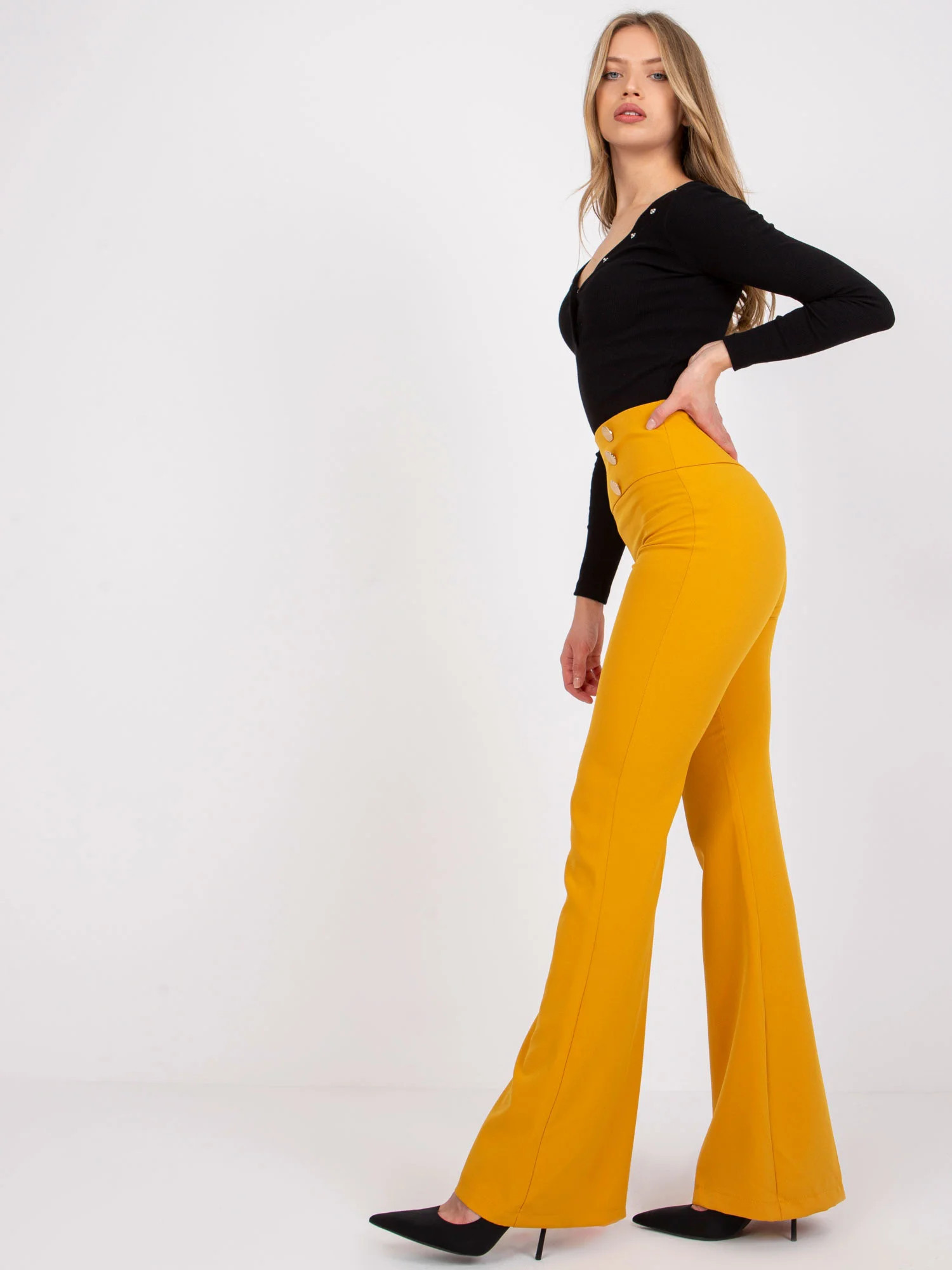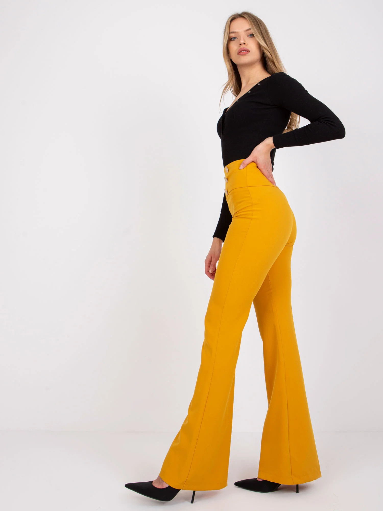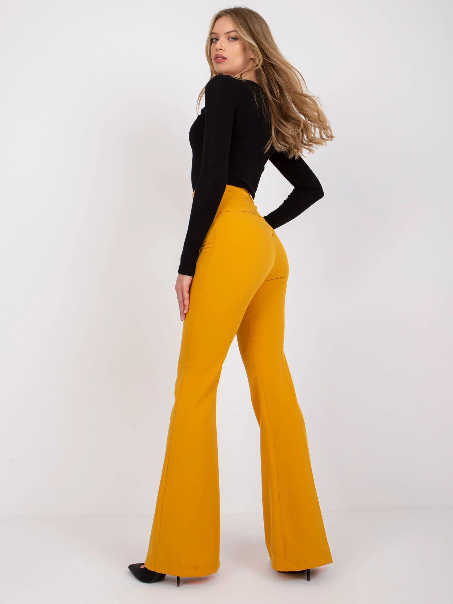 Rozměry kalhot velikosti 36 měřené na plocho: šířka v pase - 36 cm, délka kalhot - 114 cm, výška v pase - 38 cm.
