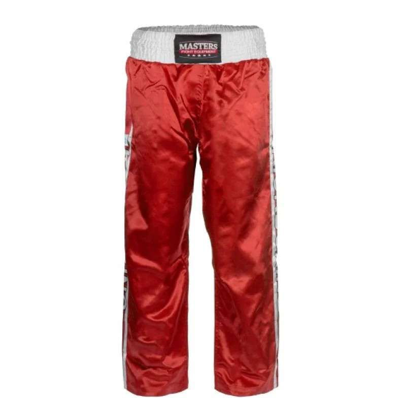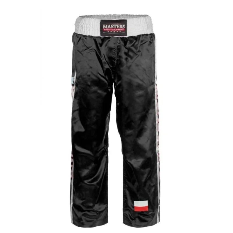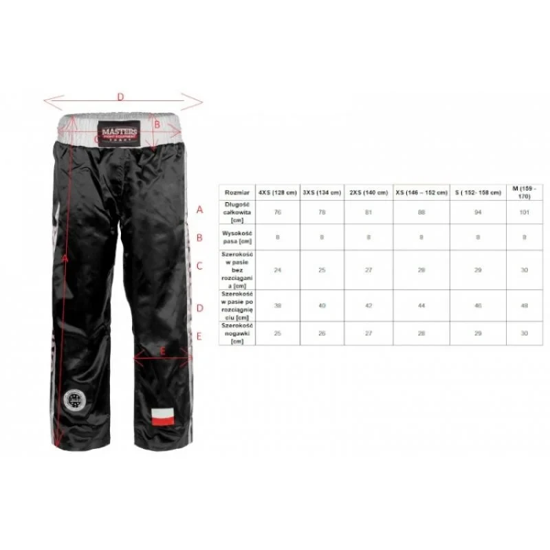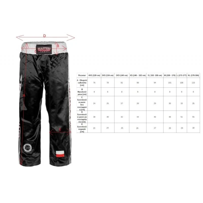 Model: Sportovní kalhoty dlouhé SKBP-100W Barva (k dispozici v nabídce výběru): černá, červená, modrá Velikost: XXXXS-XL Materiál: polyester Nohavice: dlouhé Šířka v pase: 8 cm Homologace Wako Třída A,B,C (poháry a mezinárodní turnaje).