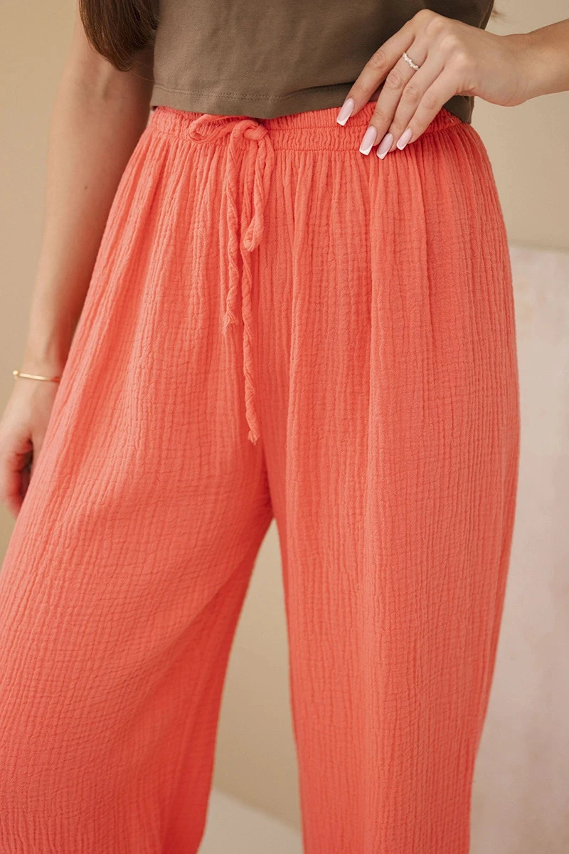 Objevte jedinečné kalhoty vyrobené z jemného, prodyšného mušelínu, které poskytují nevídaný komfort nošení i v nejteplejších dnech. Jejich široká nohavice dodává celému outfitu módní, moderní charakter, opticky prodlužuje postavu a přidává lehkost celkovému stylu. Ideální pro každodenní nošení, do práce i na výjimečné příležitosti – tyto kalhoty se skvěle kombinují s různými topy, od minimalistických triček, přes elegantní halenky až po svetry. Vsaďte na klasický, ale zároveň sofistikovaný design, který vám umožní užívat si pohodlí i originální styl. Velikost je univerzální a odpovídá ženám nosícím velikosti S, M nebo L.