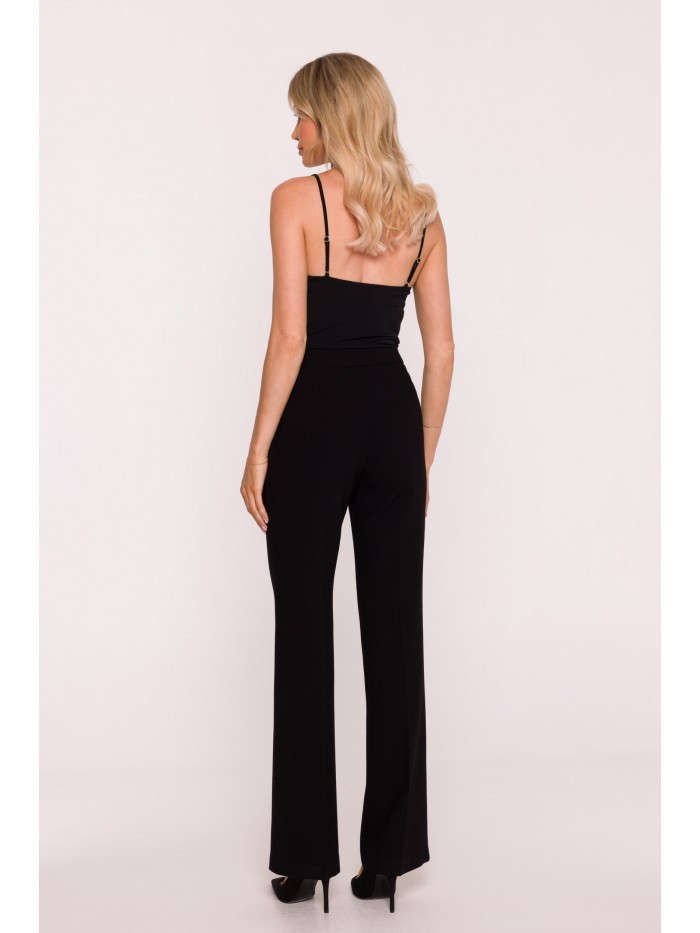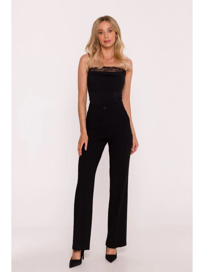 63% polyester 33% wiskoza 4% elastan LÁTKA Tkanina: hladká tkanina s měkkým povrchem PODROBNOSTI O PRODUKTU Pas: střední výška Zapínání: knoflík vpředu a skrytý zip Kapsy: boční kapsy Nohavice: dlouhé, rovné, s řasením Podšívka: žádná Model: S418 Navrženo a vyrobeno v Polsku Modelka je vysoká 174 cm a nosí velikost S STYL A STŘIH Styl: klasické kalhoty na míru Tvar: vypasované v pase a na bocích, rovné nohavice Délka: po celé délce, až na zem