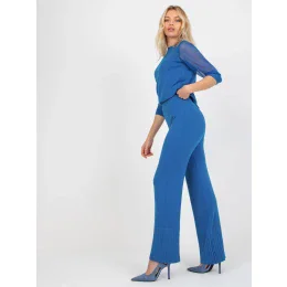 Tmavě modré pletené kalhoty se širokými nohavicemi .