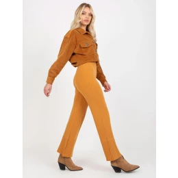 Tmavě žluté široké pletené kalhoty s vysokým pasem .