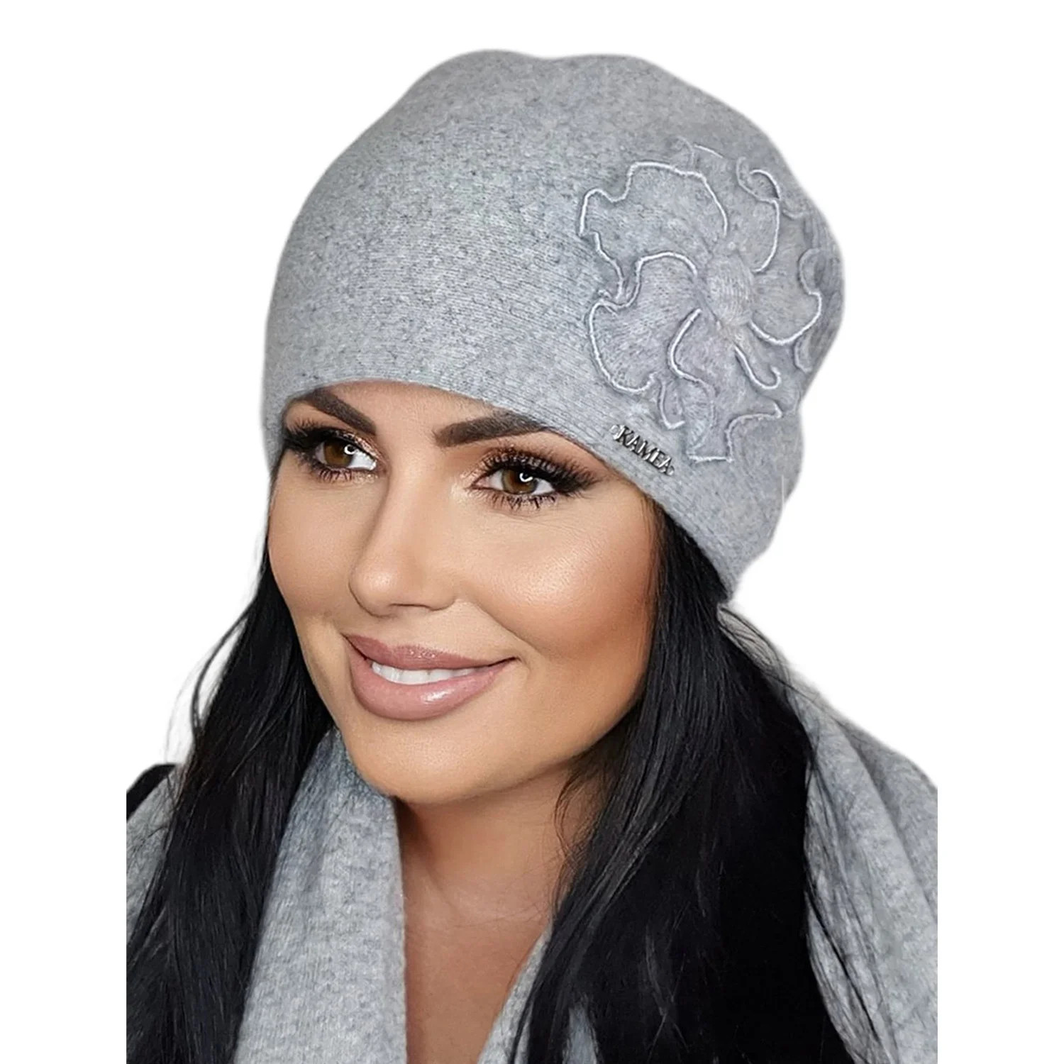 Dámská pokrývka hlavy značky Kamea, model Olimpia. Výrobek je vyroben z 80 % z vlny a 20 % z polyamidu.
