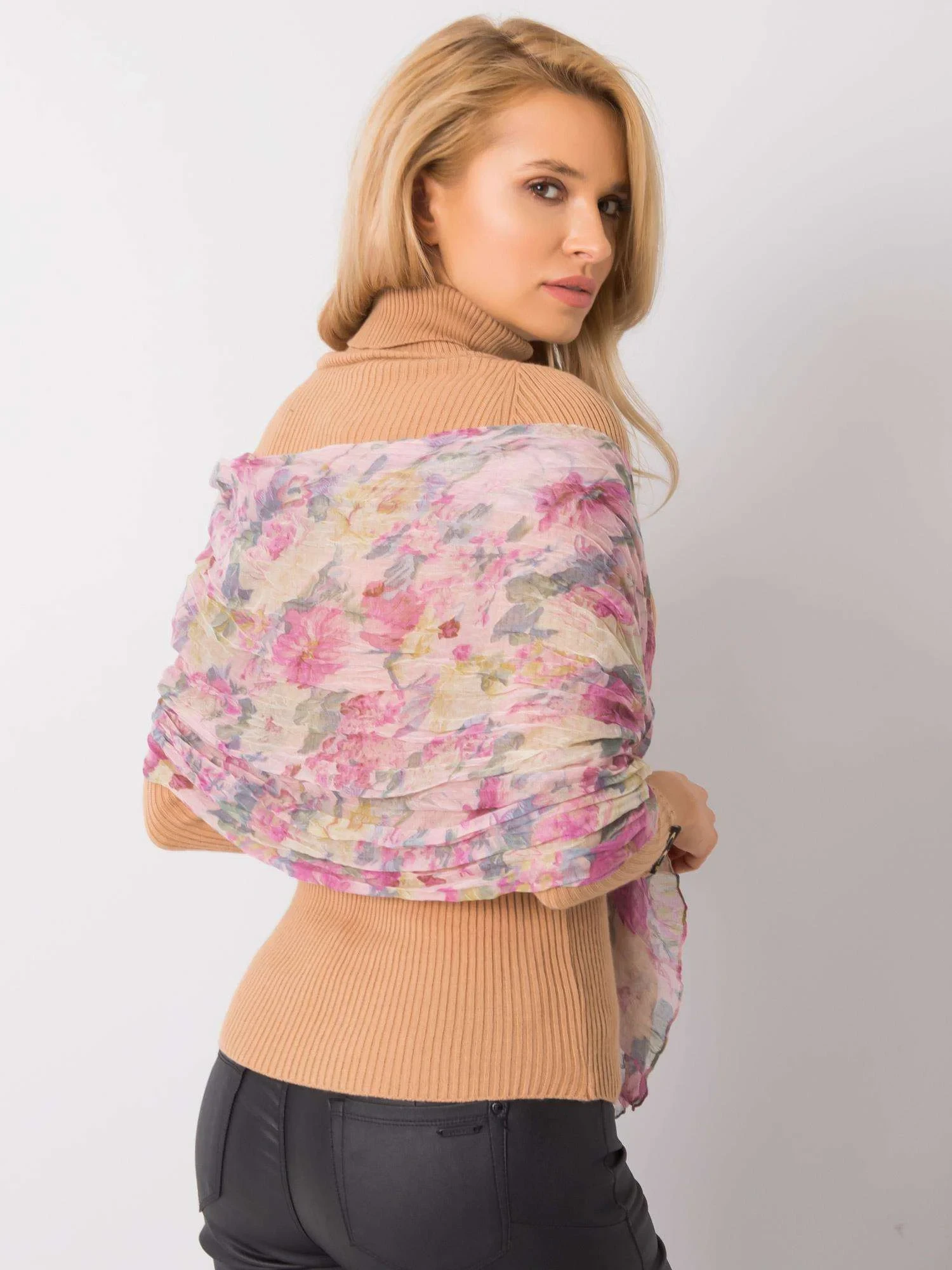 Pudrově růžový šátek s květinovým vzorem.