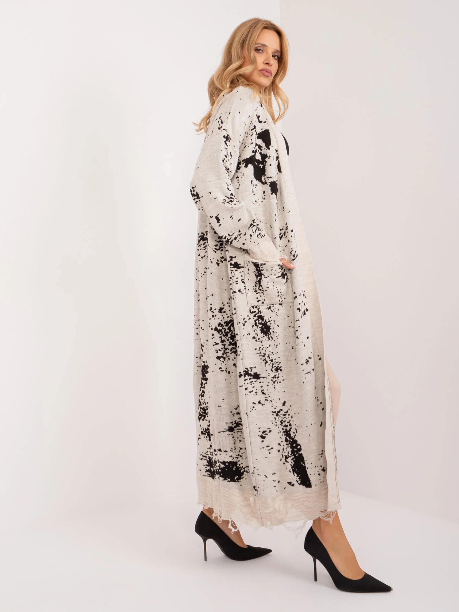 Wymiary kardiganu w rozmiarze one size mierzone na płasko: szerokość pod pachami - 66 cm, długość rękawa - 63 cm, długość całkowita - 125 cm