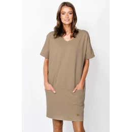 Sukienka marki Italian Fashion. Model Karina tunika kr.r.. Produkt został wykonany z 95% bawełna, 5% elastan. Posiada kieszenie. Długość rękawa: krótki. Długość: mini. Produkt damski. Rodzaj dekoltu: w serek.
