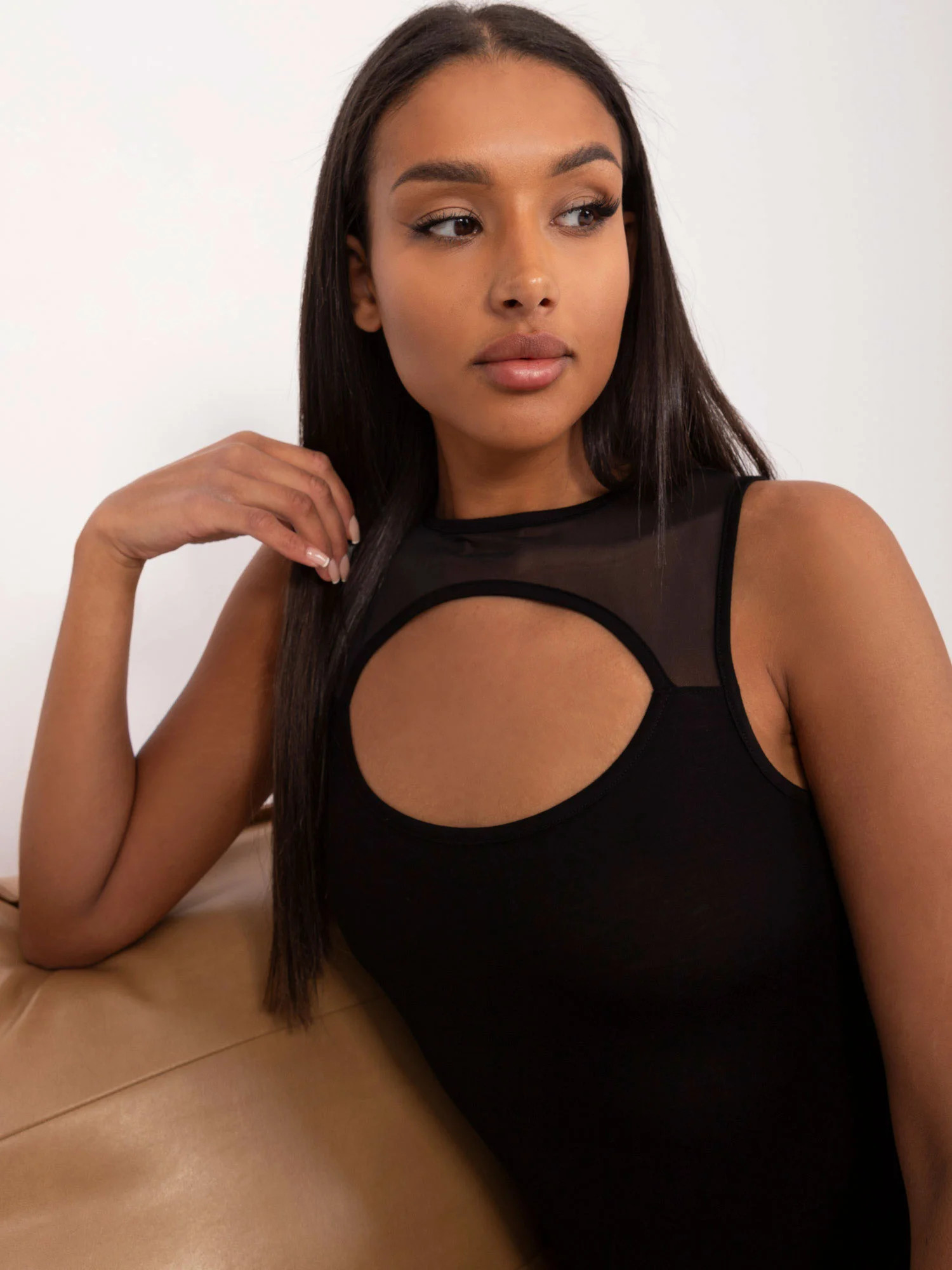 Modelka má na sobě velikost M. Rozměry modelky: výška 177 cm, prsa 94 cm, pas 70 cm, boky 99 cm.