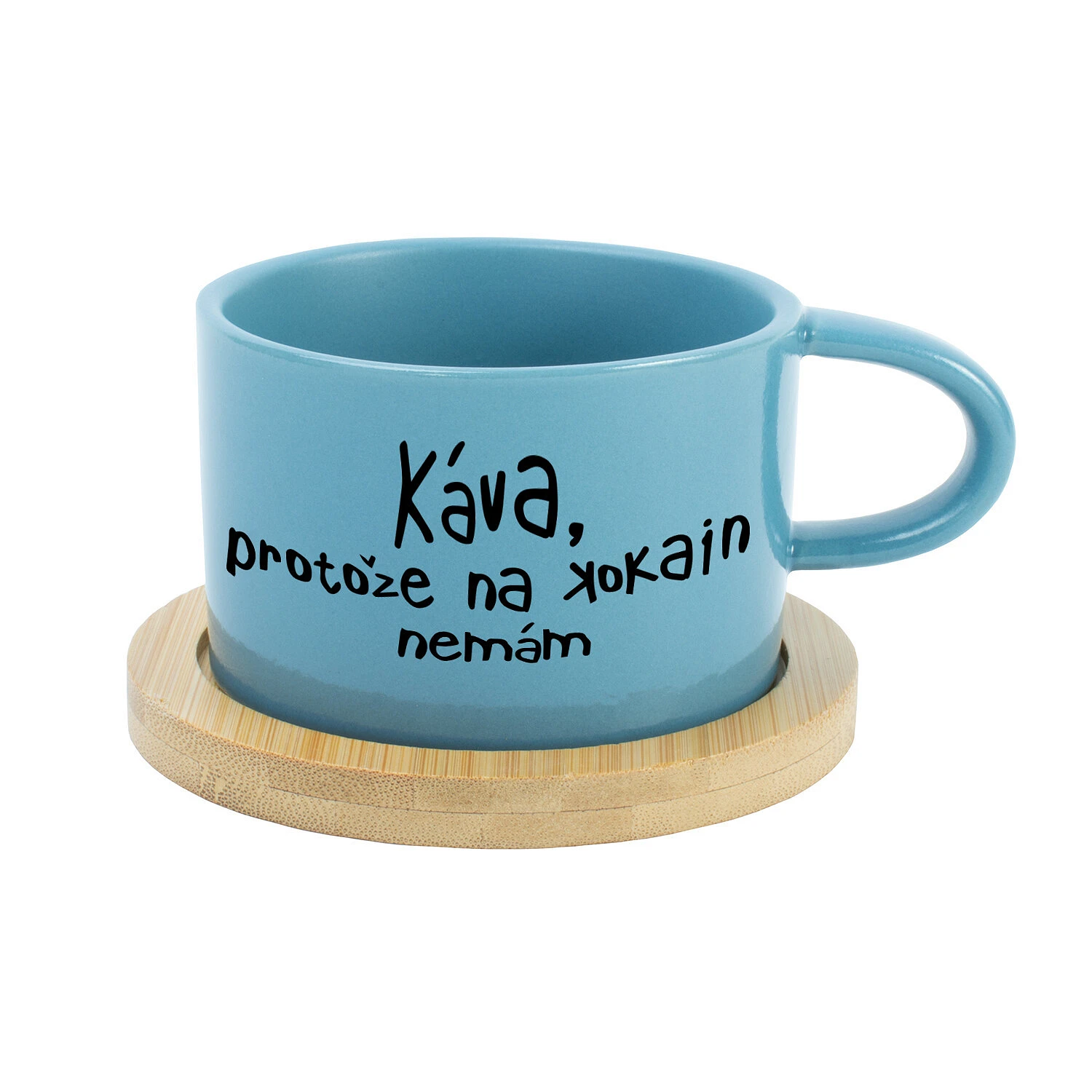 Keramický hrneček s bambusovým podtáckem – KÁVA, PROTOŽE NA KOKAIN NEMÁM